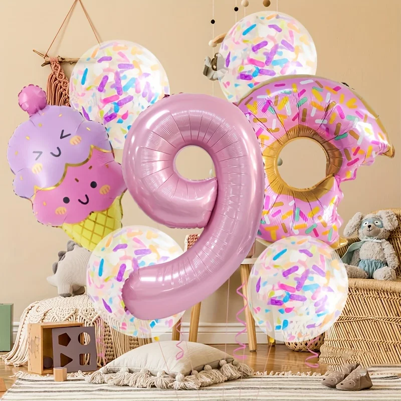 7 piezas - Juego de globos con temática de dulces y helados, incluye globos de donuts y globos de helado arcoíris, para bodas, cumpleaños