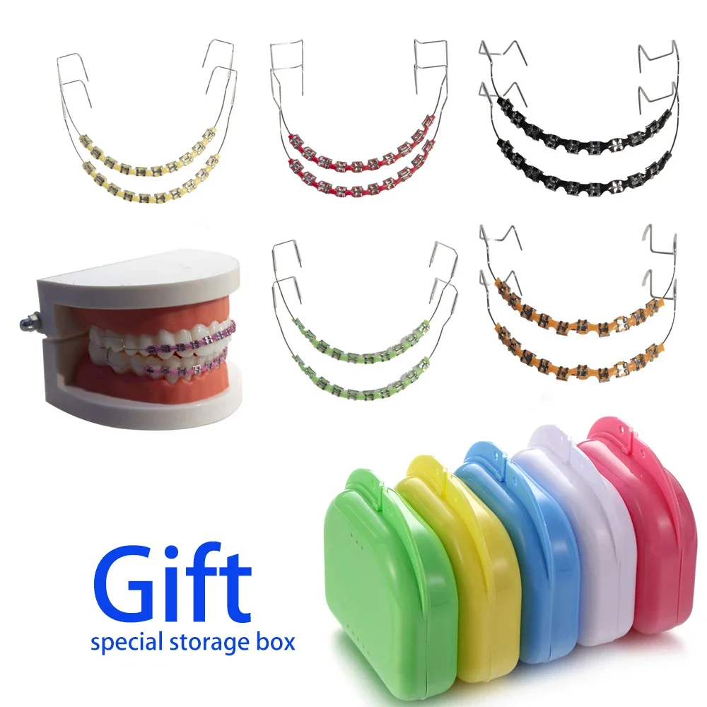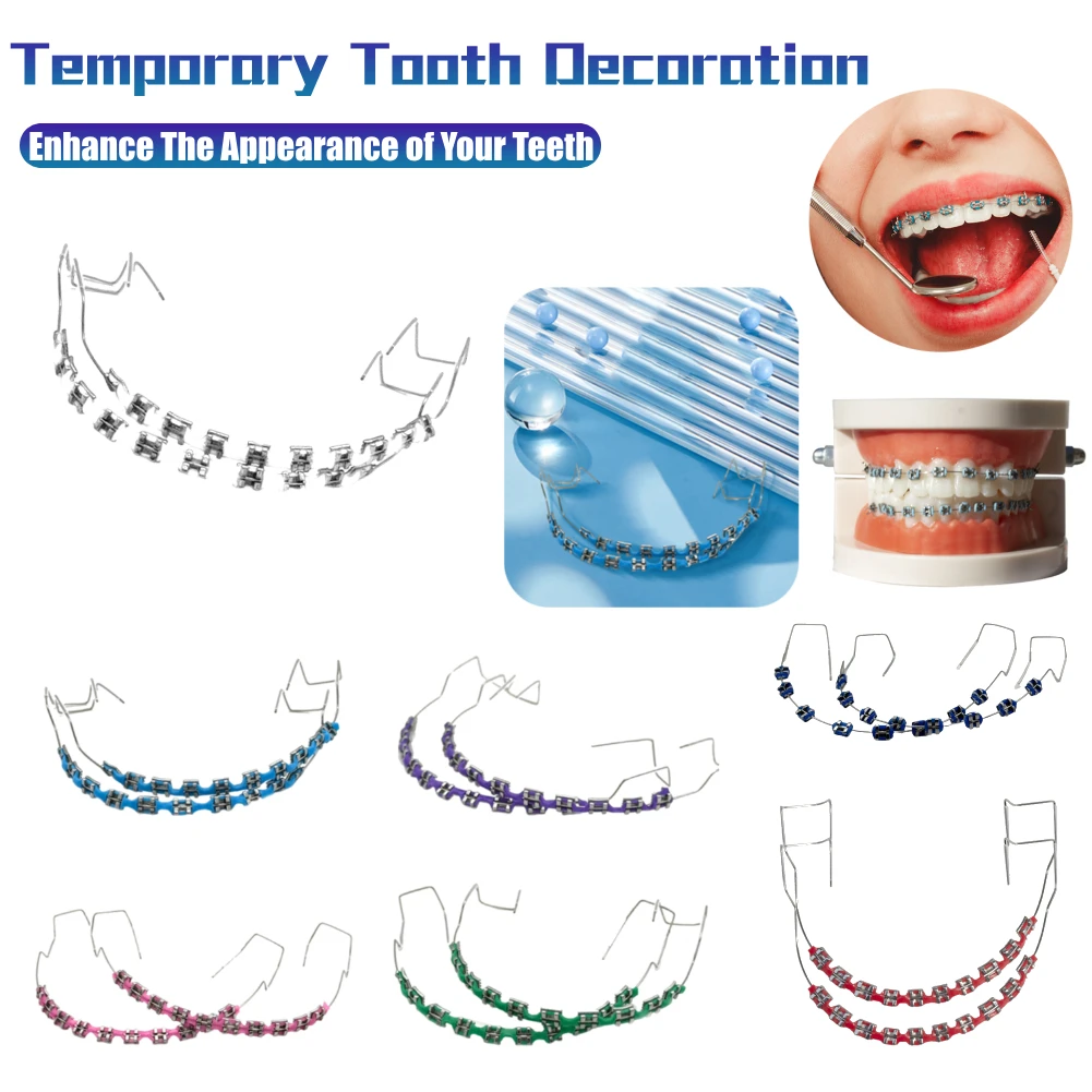 Decoración temporal colorida de odontología dental con cables de Metal, ligaduras de ortodoncia, gemas dentales, soportes falsos para dientes