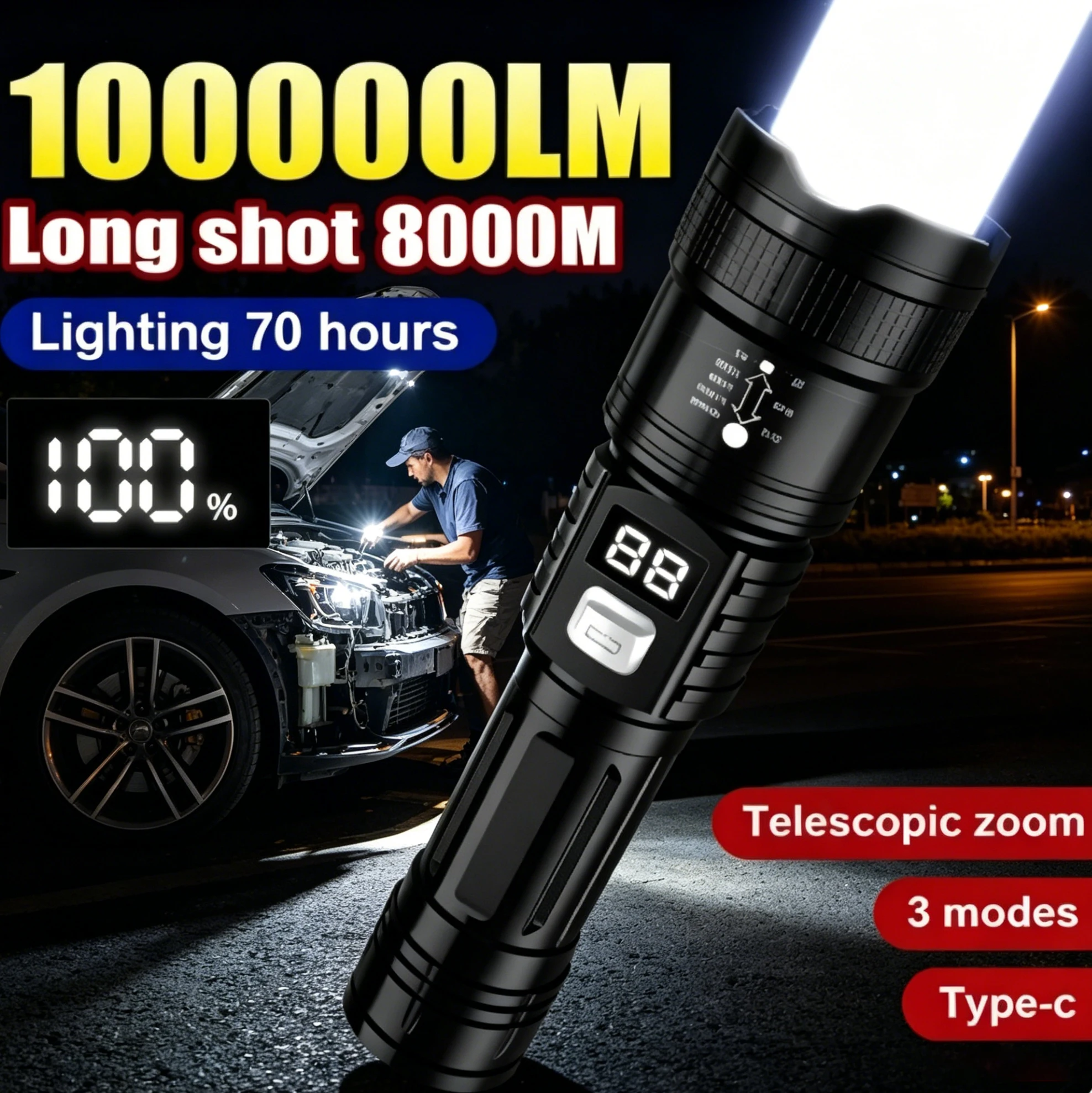 Linterna LED Recargable de 100000LM, Súper Brillante, de Largo Alcance, Táctica, Impermeable, para Acampar al Aire Libre, Pescar