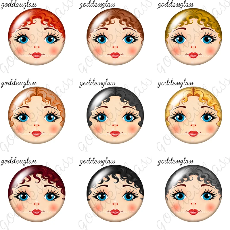 Cabujón de cristal redondo con diseño de cara de niña muñeca Matryoshka con flequillo y cabello rizado, 12mm/18mm/20mm, base plana, botones a presión, para joyería DIY