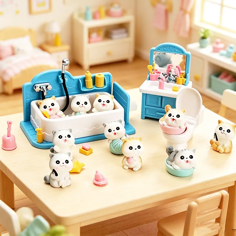 Set de Baño para Casa de Muñecas 1:12, Miniatura de Familia de Gatos, Mini Bañera, Lavabo y Inodoro para Niños, Juguetes de Juego de Imitación, Regalos