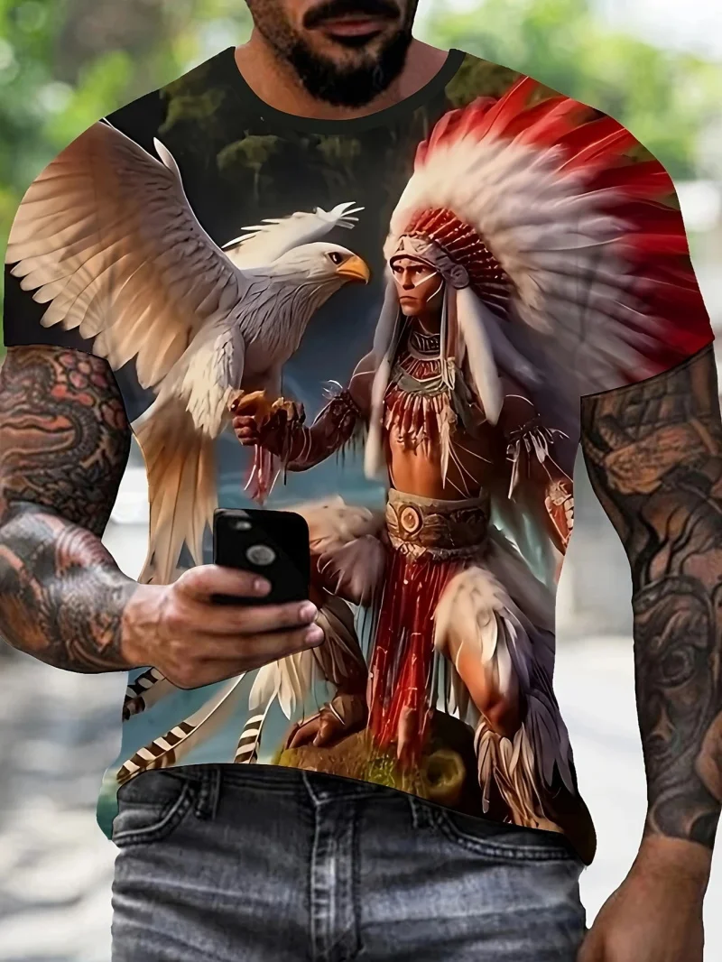 Camiseta con estampado de águila y jefe Tribal 3D de estilo nativo americano para hombre, camisetas informales de manga corta con cuello redondo, camisetas con estampado completo para hombre