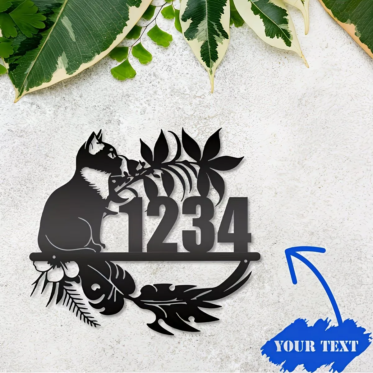 Placa de dirección de metal forjado con tema de gato perezoso personalizable - Letrero de número de casa para montar en la pared, estilo clásico, para decoración de puerta principal