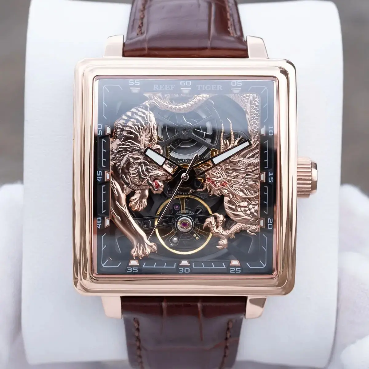 Reloj Automático Reef Tiger para Hombre, Diseño Cuadrado de 39 mm, Mecánico, Luminoso, con Esfera de Dragón y Tigre en Relieve, Cristal de Zafiro