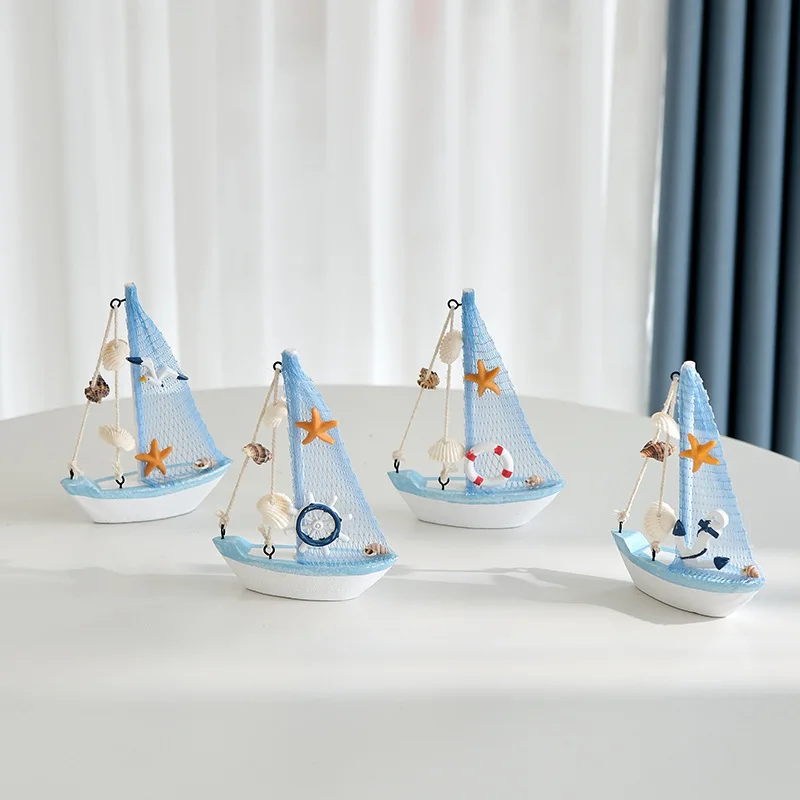 Mini red de pesca mediterránea, conchas, barco de vela pequeño de madera, modelo de barco de madera, artesanía, adorno de escritorio, decoración del hogar para habitación de niños, regalo