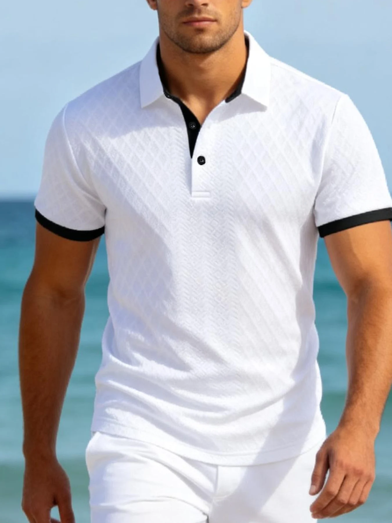 Polo de manga corta para hombre, informal, deportivo, con bloques de color jacquard, con botones y cuello tipo polo.