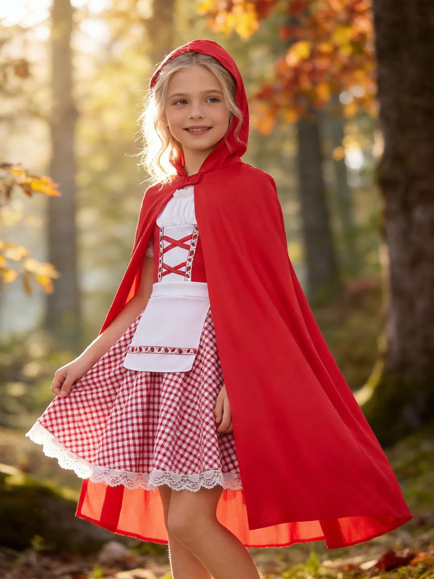 Disfraz de Caperucita Roja para Niñas, Traje de Halloween, Capa con Capucha Roja, Vestido de Encaje a Cuadros con Fresas, Disfraz de Cuento de Hadas