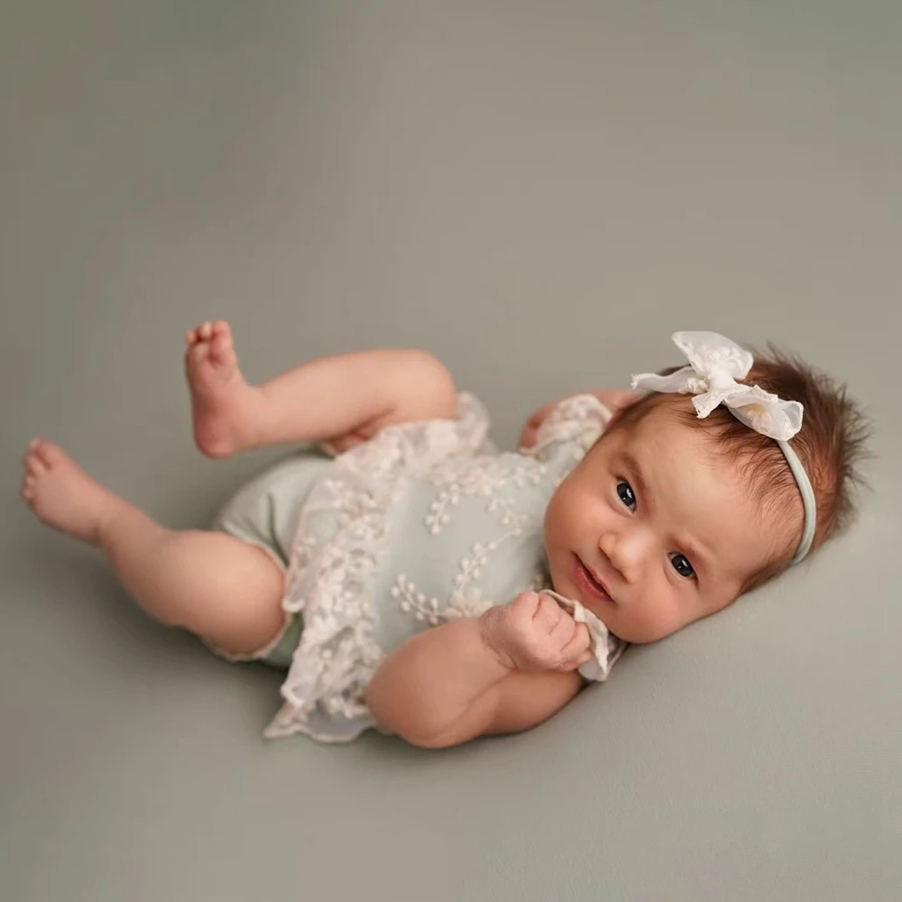 Conjunto de Ropa para Fotografía de Recién Nacida, Romper de Encaje Verde Pastel con Bordado Floral, Estilo Romántico