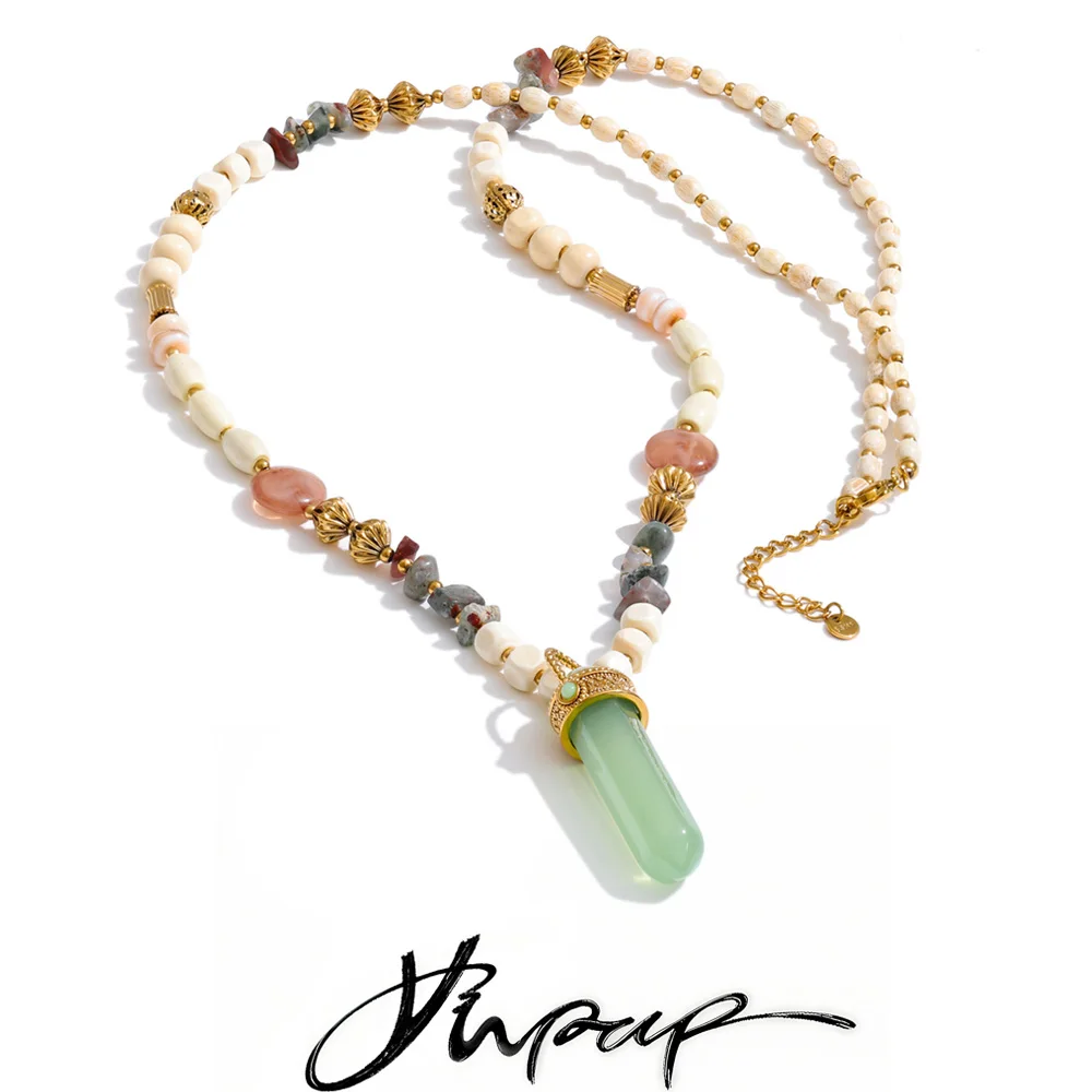 Yhpup 82+5cm Collier long statement en acier inoxydable, résine, pierre, acrylique et perles de bois, fait main, étanche, style français