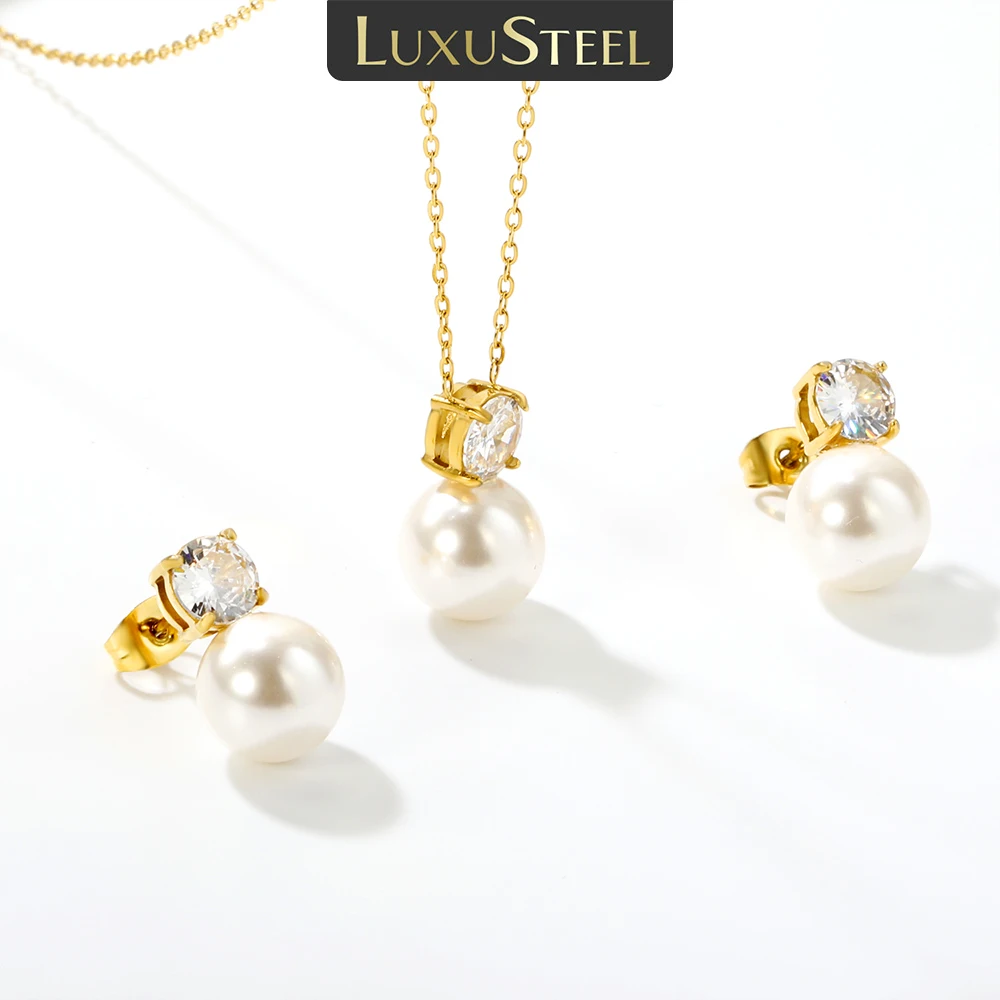 Ensemble de boucles d'oreilles et collier avec pendentifs en perles d'imitation de luxe pour femmes, zircone cubique, chaîne en acier inoxydable, ensembles de bijoux