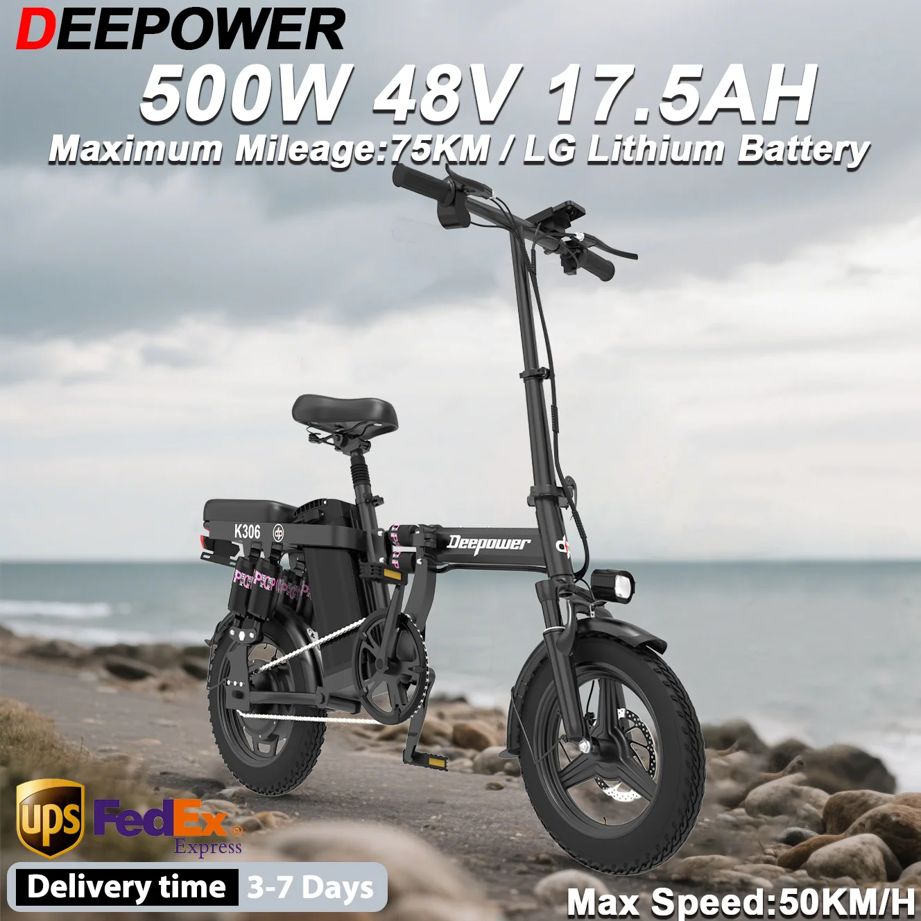 Vélo électrique DEEPOWER K306 500W 48V 17.5AH Batterie au lithium Mini vélo électrique pliable 35KM/H Vélo de ville unisexe Ebike