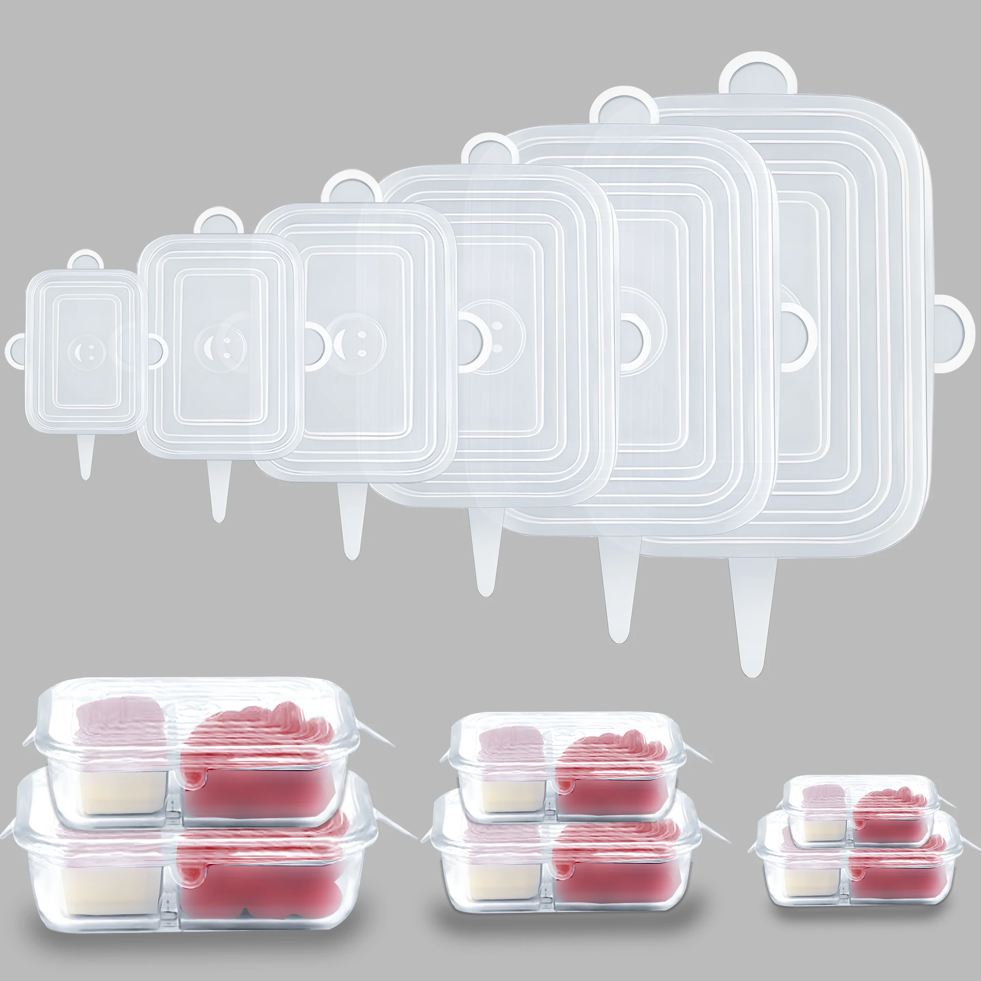 Couvercles de stockage des aliments rectangulaires en silicone de 6 pièces, 6 tailles, couvercles de stockage réutilisables et hermétiques.