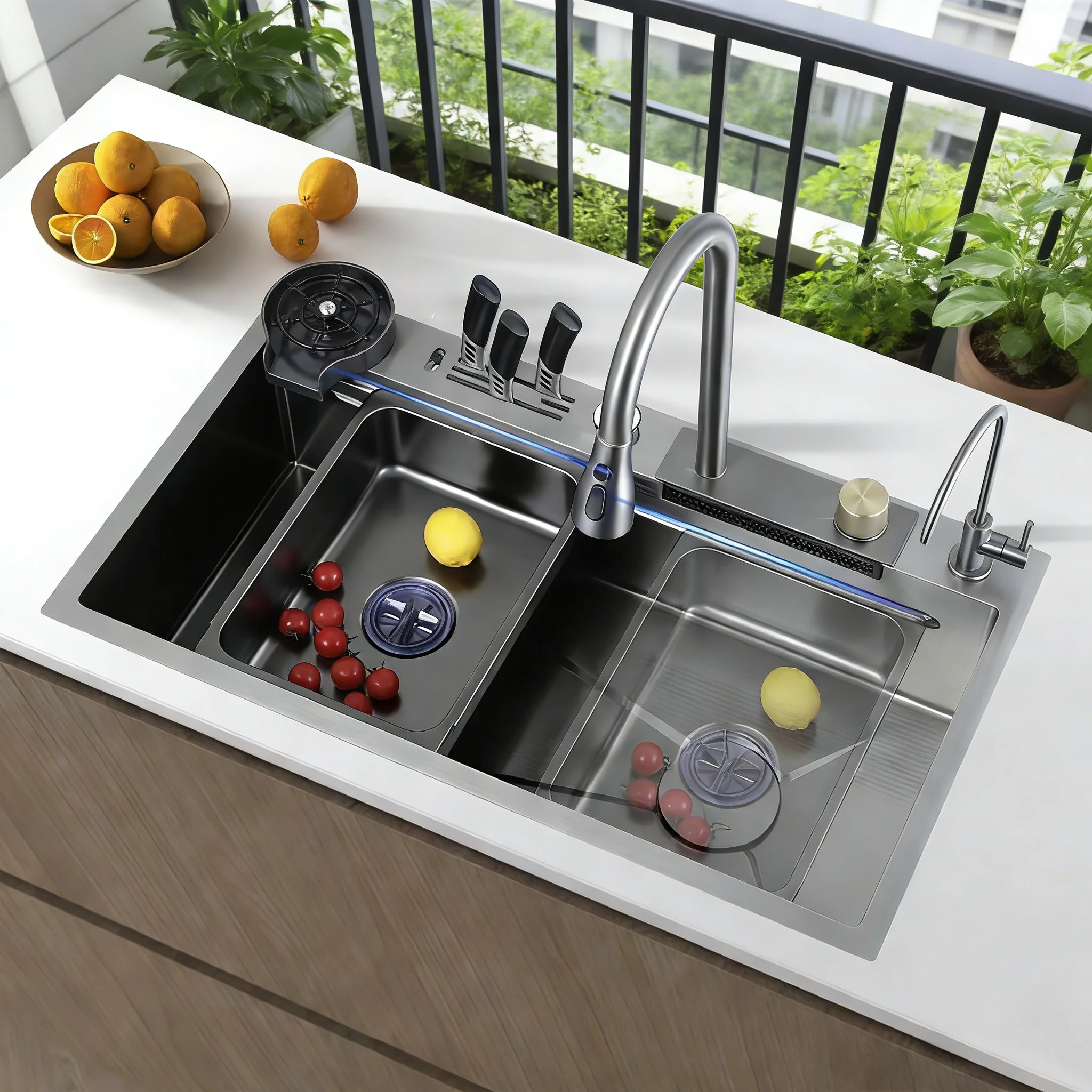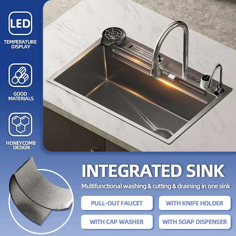 Évier de cuisine avec affichage numérique LED, évier intelligent cascade 75x45cm, bol simple profond en acier inoxydable, éviers Nano encastrés