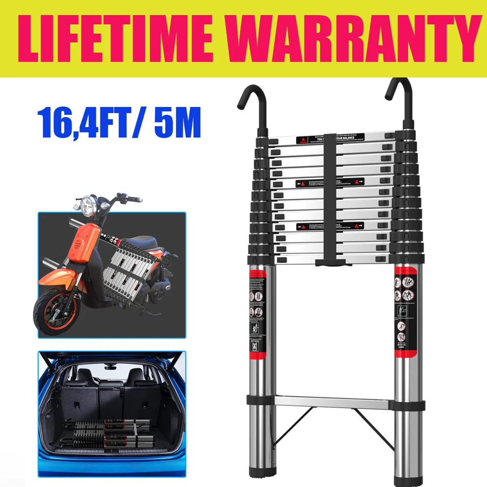 Échelle extensible en acier inoxydable de 5 m/16,5 pieds avec barre stabilisatrice, crochets détachables, échelle de grenier multifonctionnelle, échelle escamotable portable, échelle pliante, 15 marches, charge maximale 150 kg, EN131