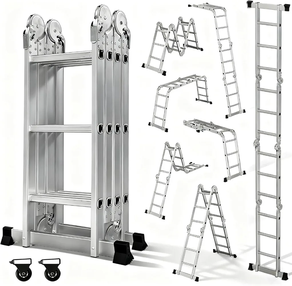 Échelle multifonction 7 en 1, échelle pliante en aluminium 350 cm à usage multiple avec 2 roues, échelle domestique, charge maximale 150 kg
