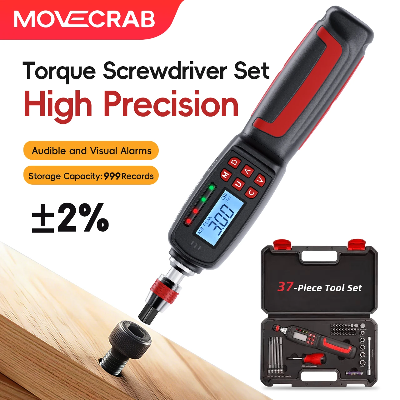 MoveCrab Kit de tournevis dynamométrique numérique 0,2-10 Nm haute précision 1/4 "entraînement avec 37 embouts et douilles pour la mécanique de précision