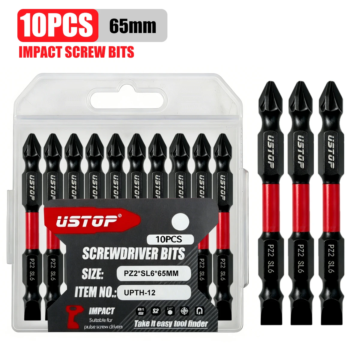 Jeu de 10 embouts de tournevis à double extrémité Phillips et plat Pz2/Sl 6m, en acier S2, 65 mm, magnétiques, anti-torsion, pour tournevis à chocs de réparation domestique