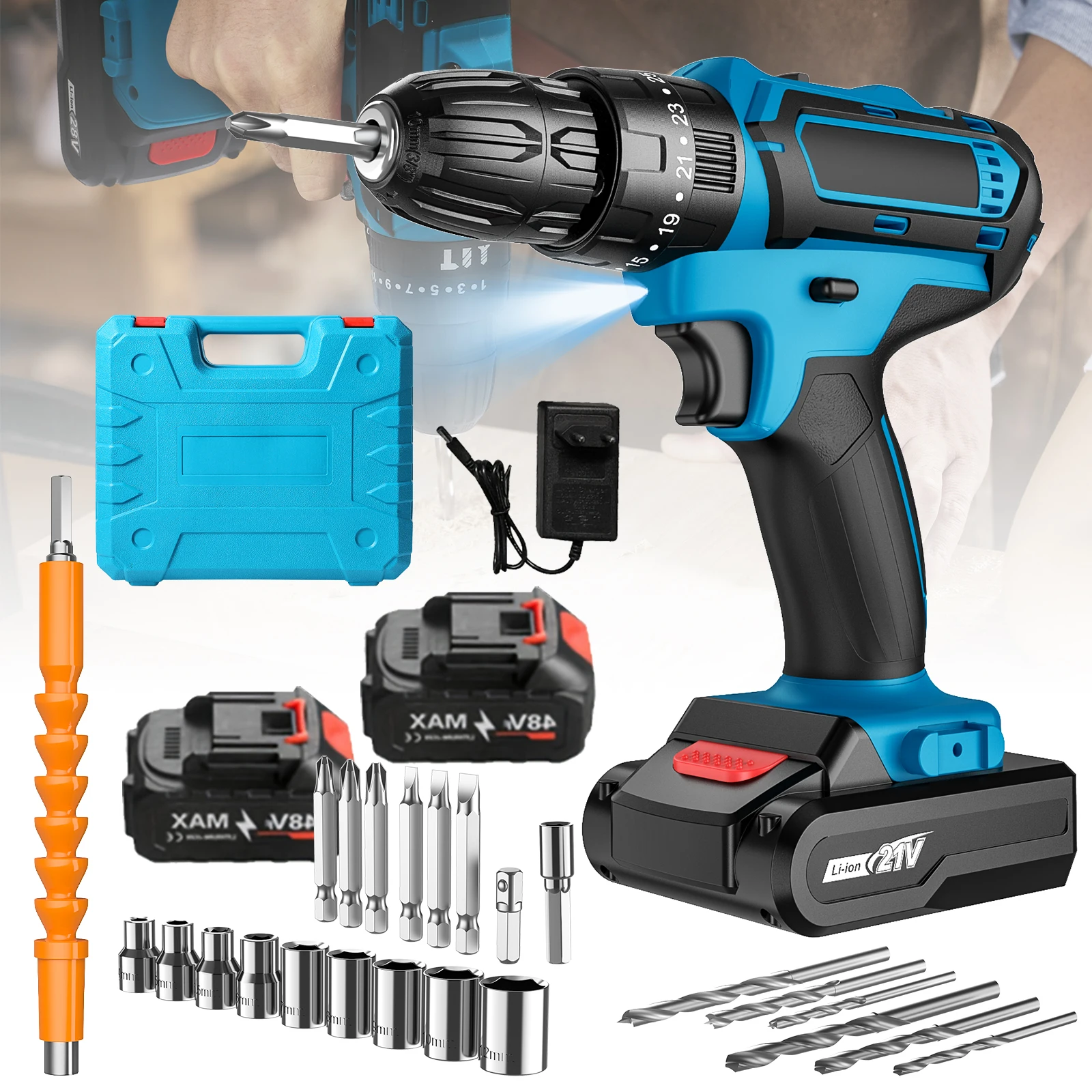 Perceuse électrique 21V, tournevis électrique 32Nm, tournevis électrique, perceuse électrique portative avec 24 accessoires, lumière LED