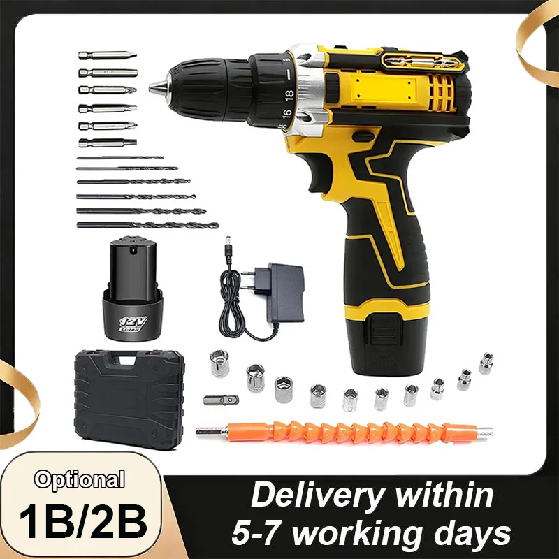 Perceuse au lithium 12V avec moteur à balais 45N. Ensemble de perceuse à main multifonctionnelle m torque: 18+1, tournevis électrique 1400 tr/min