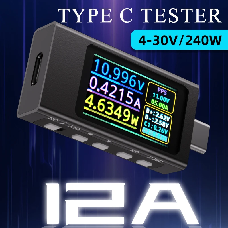 Testeur Type C KWS-X1 4-30V 0-12A Voltmètre Ampèremètre Détection de Charge Rapide TYPE-C Mesure de Capacité Mesure d'Ondulation