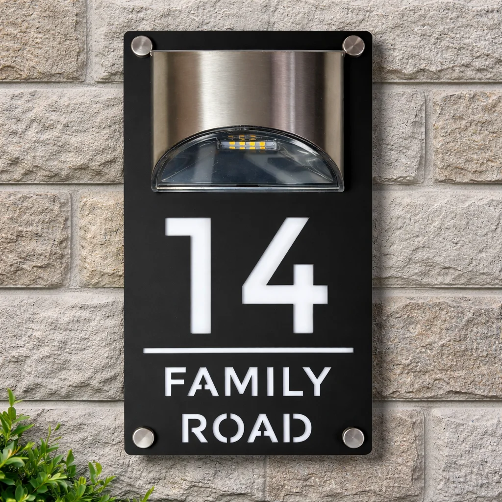 Numéro de maison personnalisé noir et blanc moderne, panneau lumineux solaire extérieur, Plaque d'adresse en acrylique découpée au Laser, Plaque cadeau murale Led