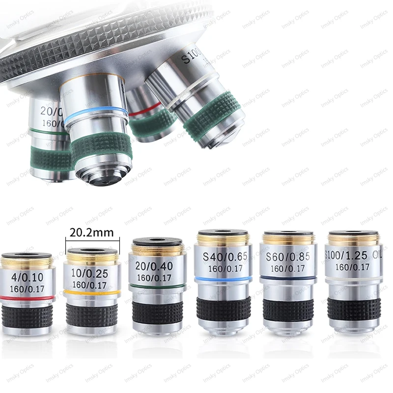 Lentille d'objectif en cuivre pur achromatique pour Microscope Seattle, Distance de conjuguation 185mm, 4X, 10X, 20X, 40X, 60X, 100X, RMS 20.2mm, 185