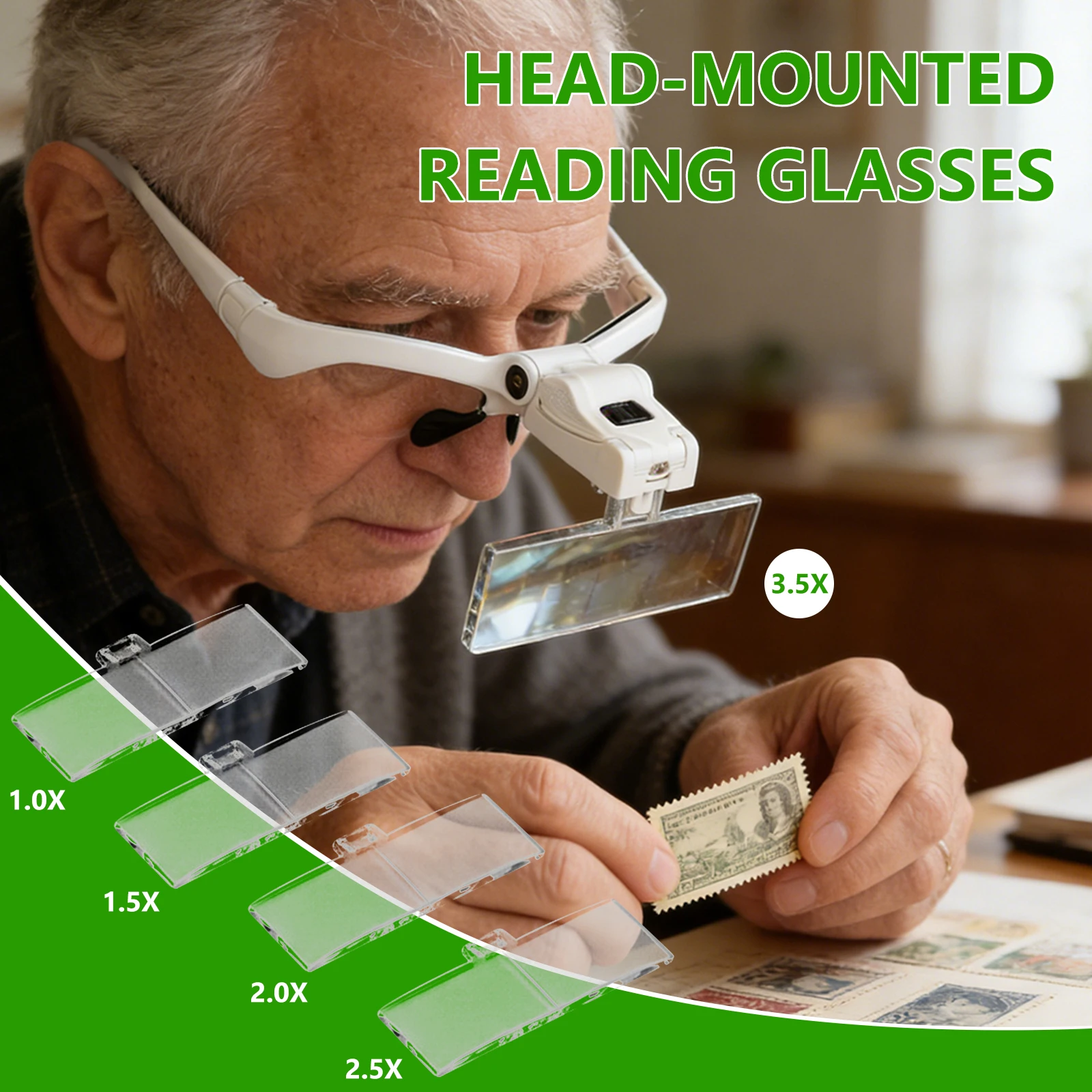 Loupe frontale LED avec 5 lentilles interchangeables de 1,0x à 3,5x, loupe à fixation sur la tête pour la lecture et l'inspection de bijoux