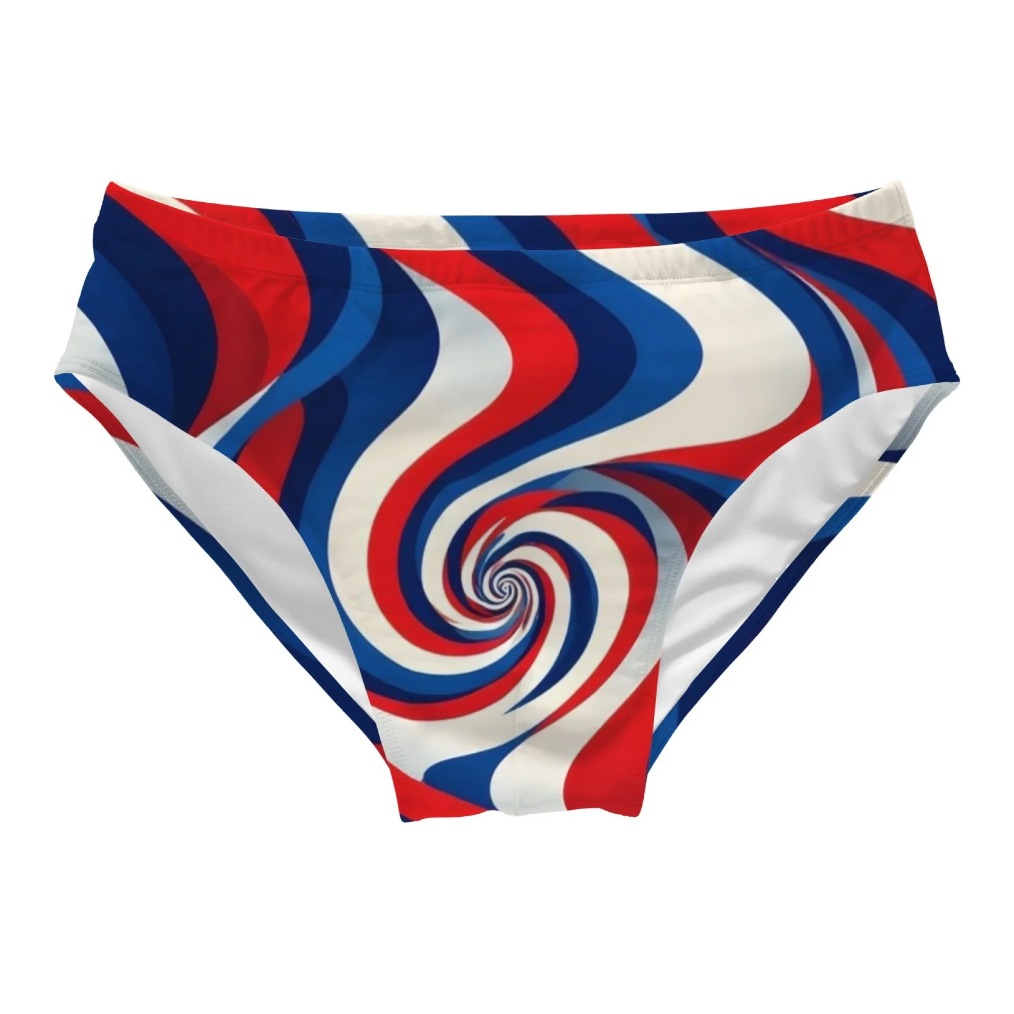 Maillot de bain triangle pour hommes, design spirale rouge, bleu et blanc, léger, antidérapant, respectueux de la peau, pour les vacances, le fitness, les sports nautiques