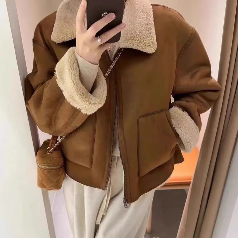 Veste décontractée à col rabattu, plus épaisse, vintage, chaude, courte, tendance, en fourrure d'agneau, automne-hiver