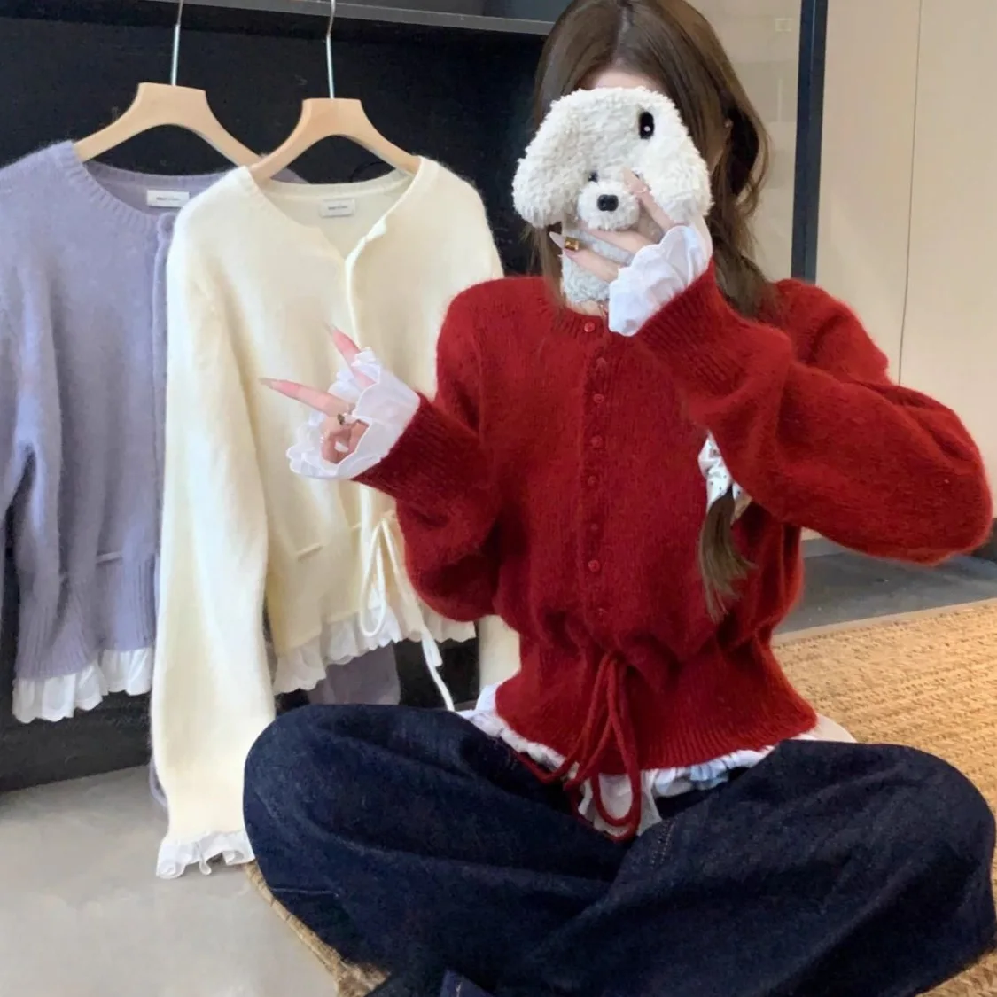 Pull de maternité en maille douce à bords dentelés, couleur unie, avec laçage à la taille, pour femme