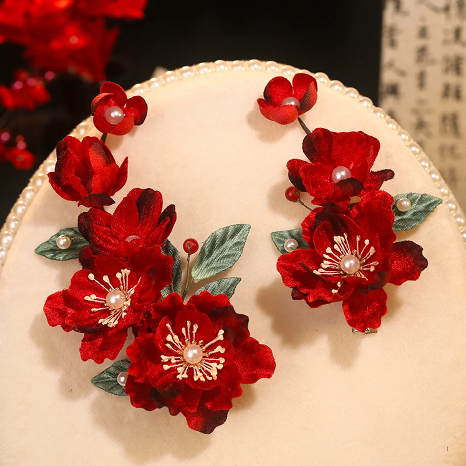 1 paire de pinces à cheveux à fleurs rouges, Barrettes de mariage de Style chinois avec perles d'imitation, diadèmes de mariée, épingles à cheveux Vintage Cheongsam Deocr