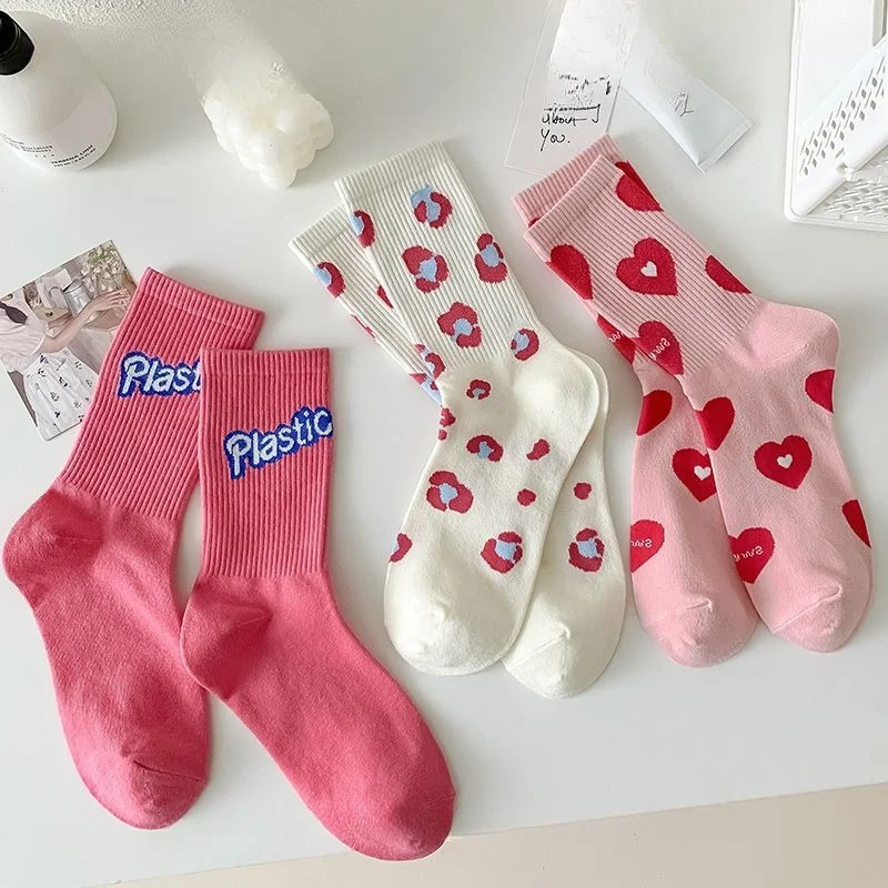 1/3 Paires de Chaussettes Roses pour Femmes, Nouvelle Collection Printemps, en Pur Coton, Tendance Urbaine, Mignonnes, à Motifs Lettres et Léopard, Chaussettes de Sport Mi-Mollet