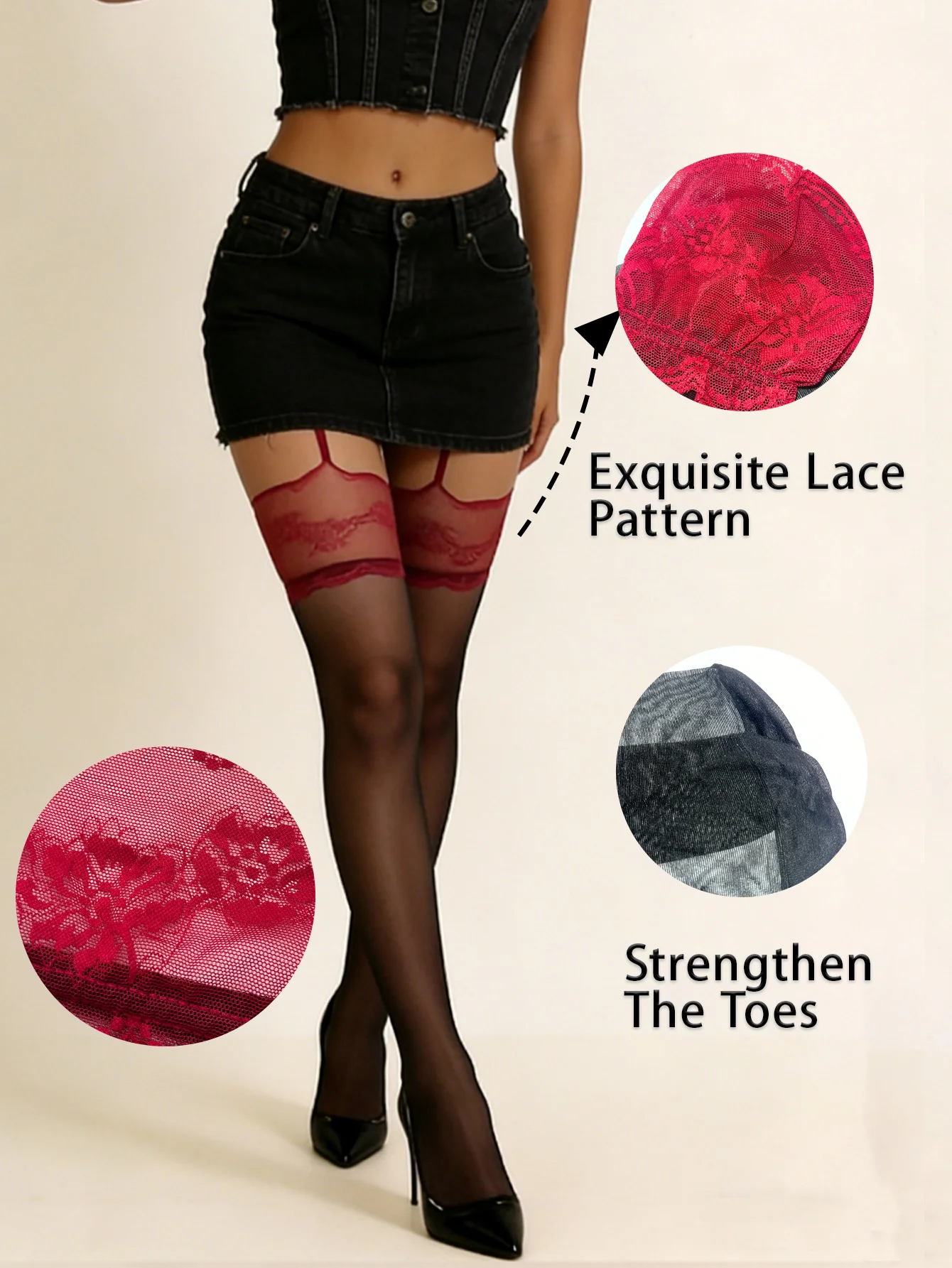 Bas cuissardes noirs transparents pour femme avec dentelle florale rouge, lingerie sexy avec porte-jarretelles pour tenues de soirée et de club
