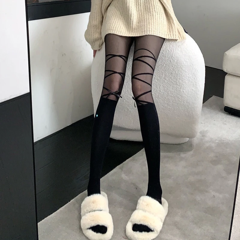 Collants résille pour femme, style japonais, imprimé bandage croisé, ajourés, avec nœud, noir et blanc