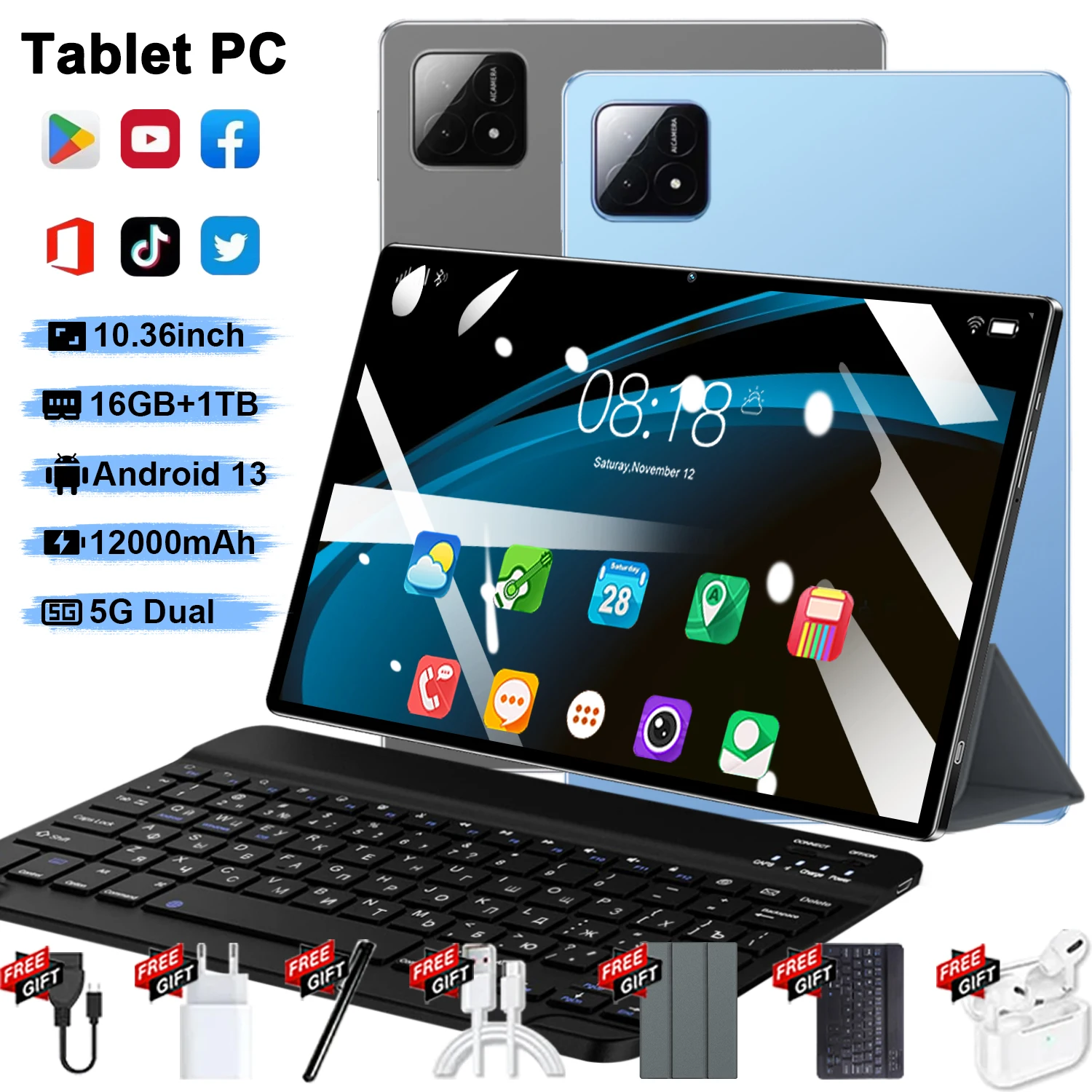 2025 5g Global dernier 10.36 pouces Android 13 Pad 16GB + 1TB 12000mAh 10core 16MP 32MP WIFI type-c tablettes pour étudier tablette Android