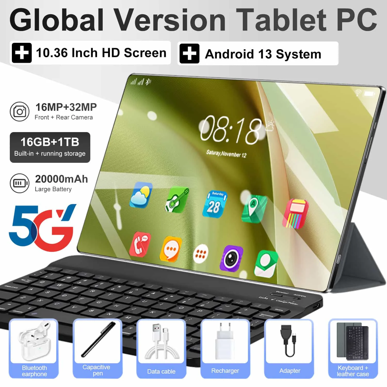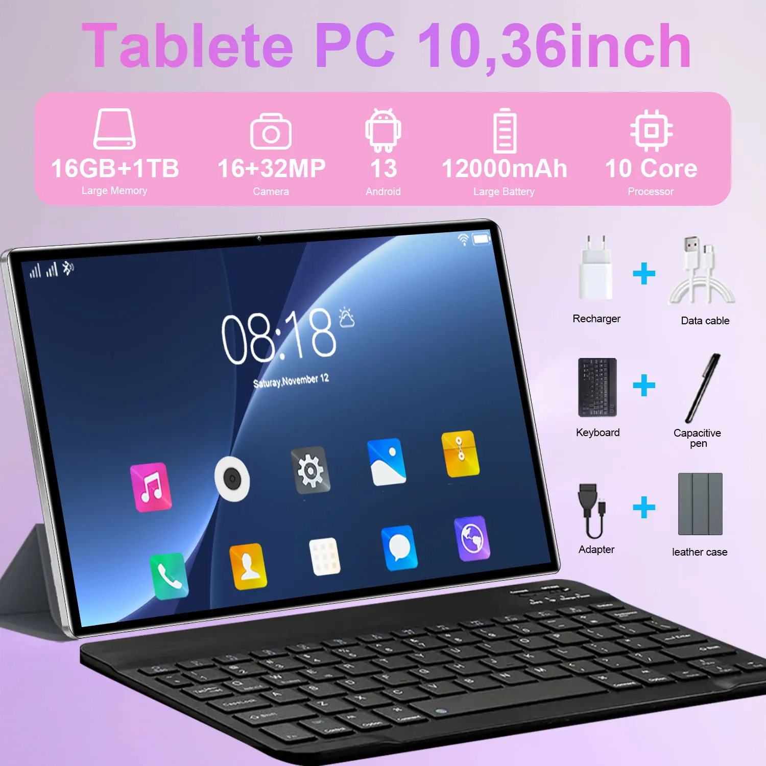Tablette mondiale 2026 de 10,36 pouces, 14 cœurs, 16 Go + 1 To, Android 13, 20000 mAh, Wi-Fi, GPS, Bluetooth, double SIM, HD, pour étudiants