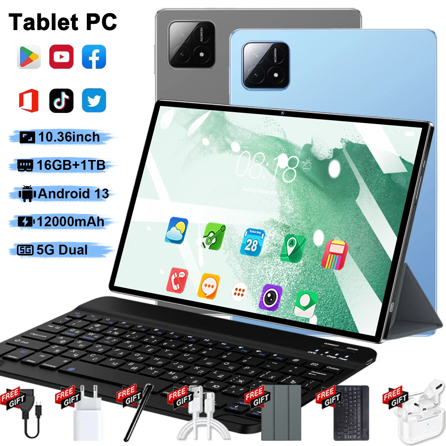 2025 tablette d'origine Android13 10.36 pouces HD 16GB + 1TB 12000mAh 10 cœurs 5G double SIM Bluetooth WiFi GPS Tables