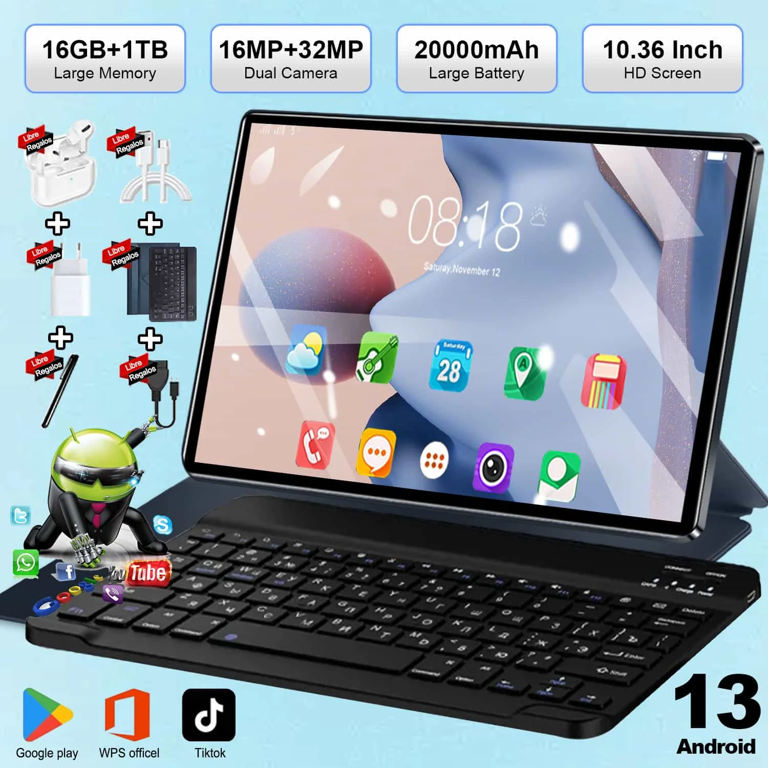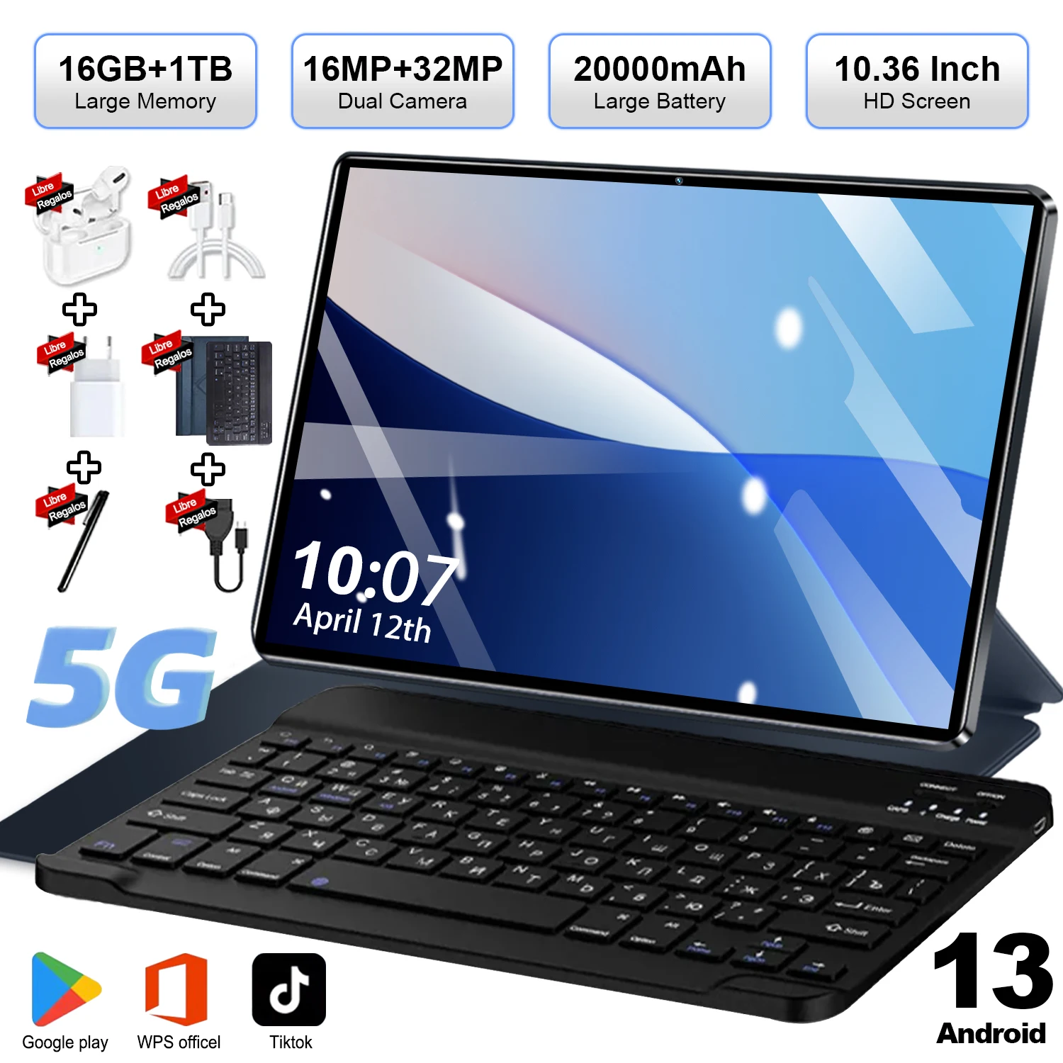 Tablette Android 13, 10.36 pouces, 5G, Android 13, écran IPS adaptatif pour soins oculaires, stockage de 16 go + 1 to, batterie 20000mAh, WiFi BT pour multitâche sans couture