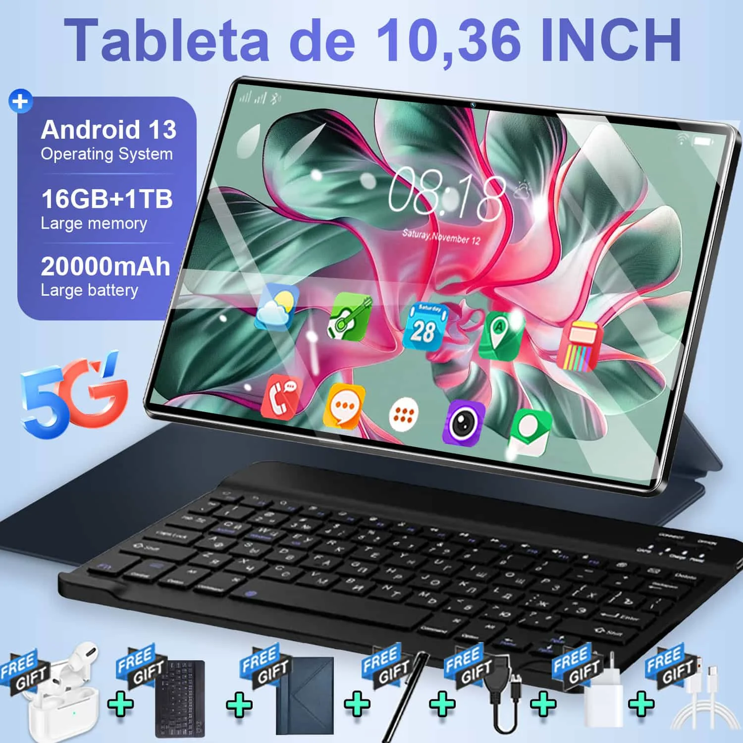 Version mondiale nouveau 5G 10.36 pouces tablette Android 16GB Ram 1TB Rom 20000mAh Android 13.0 réseau WIFI 14 Core WPS bureau 4K HD écran tablette PC type-c avec clavier Bluetooth
