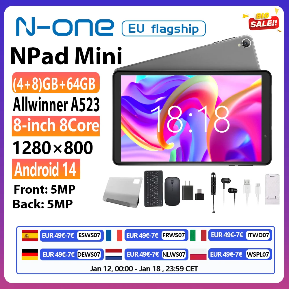 N-one-Tablette 8 pouces Android 14, 12 Go de RAM, octa-core, prise en charge du WiFi 5G