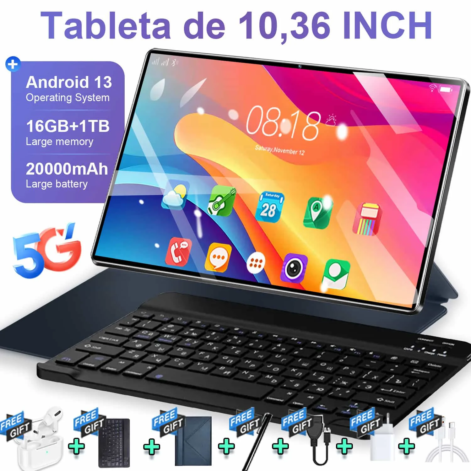 2025 tablette 5G haute vitesse 10.36 "Android 13 écran IPS 16GB + 1 to de stockage 20000mAh batterie WiFi BT pour l'étude de voyage de productivité