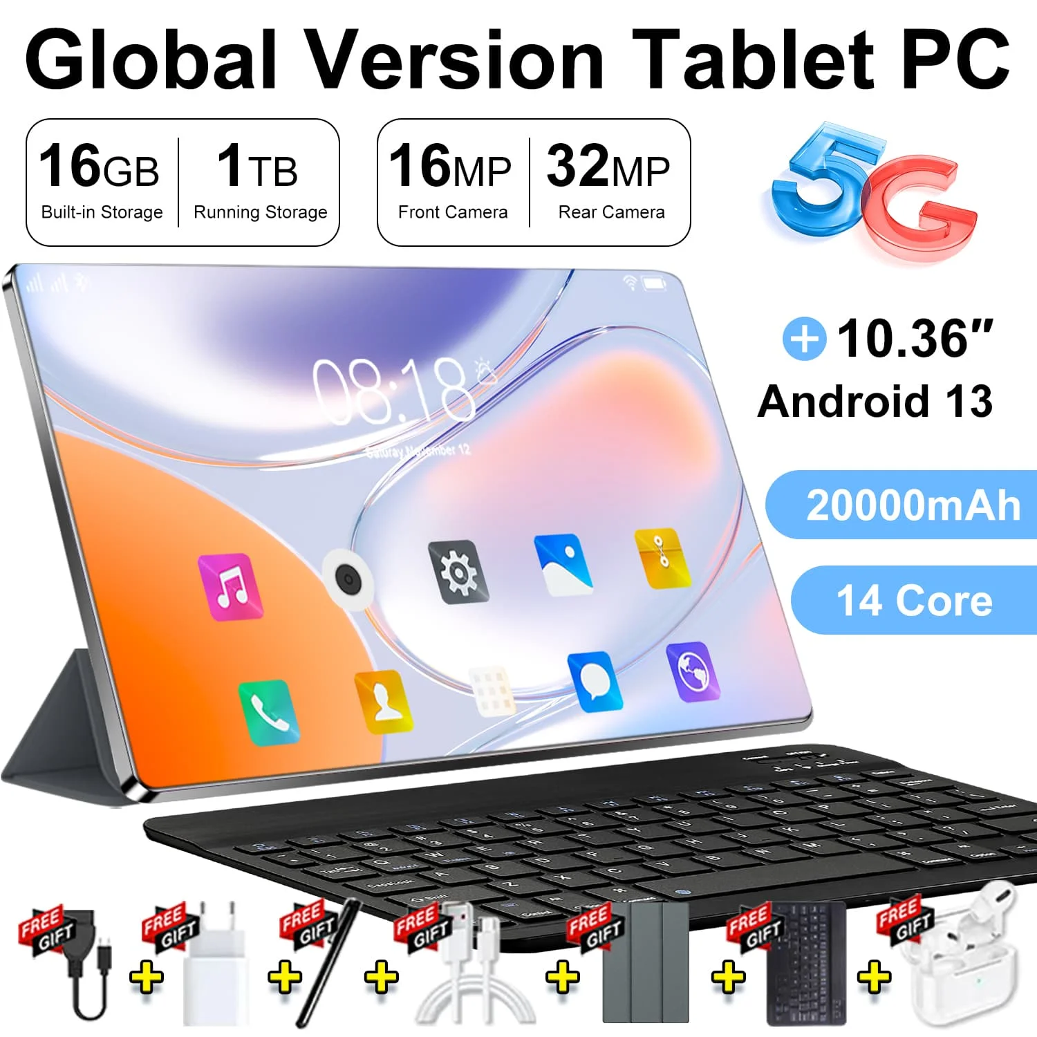 Tablette Android double SIM 10.36 pouces, 16 go + 1 to, 20000mAh, 5G, 14 cœurs, pour jeu, bureau, double caméra, GPS, WIFI