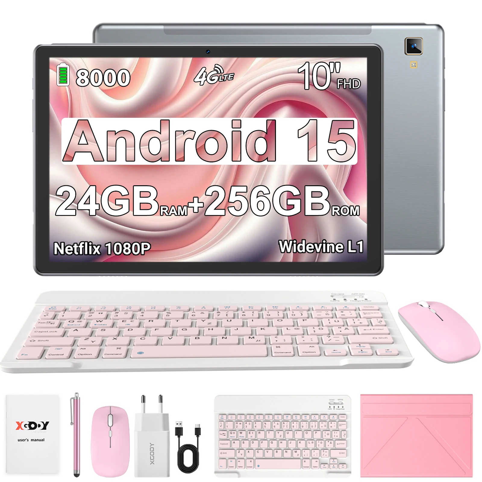 Tablette Android 15 4G LTE 2SIM, 24 go (8 + 16), RAM + 256B ROM, avec étui pour clavier et souris roses, écran 10.1 pouces, 8 cœurs, 8000mah, BT 5.0