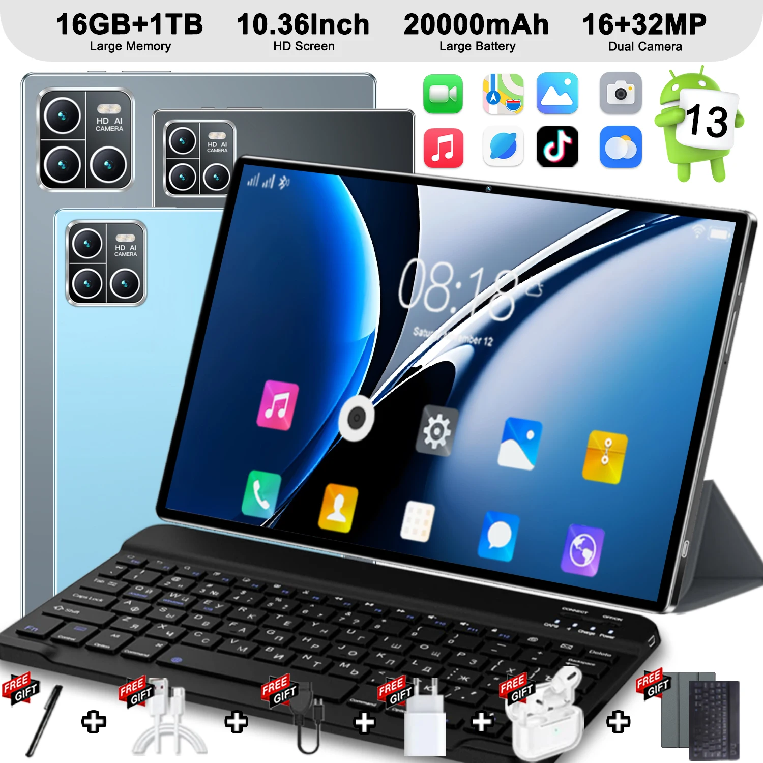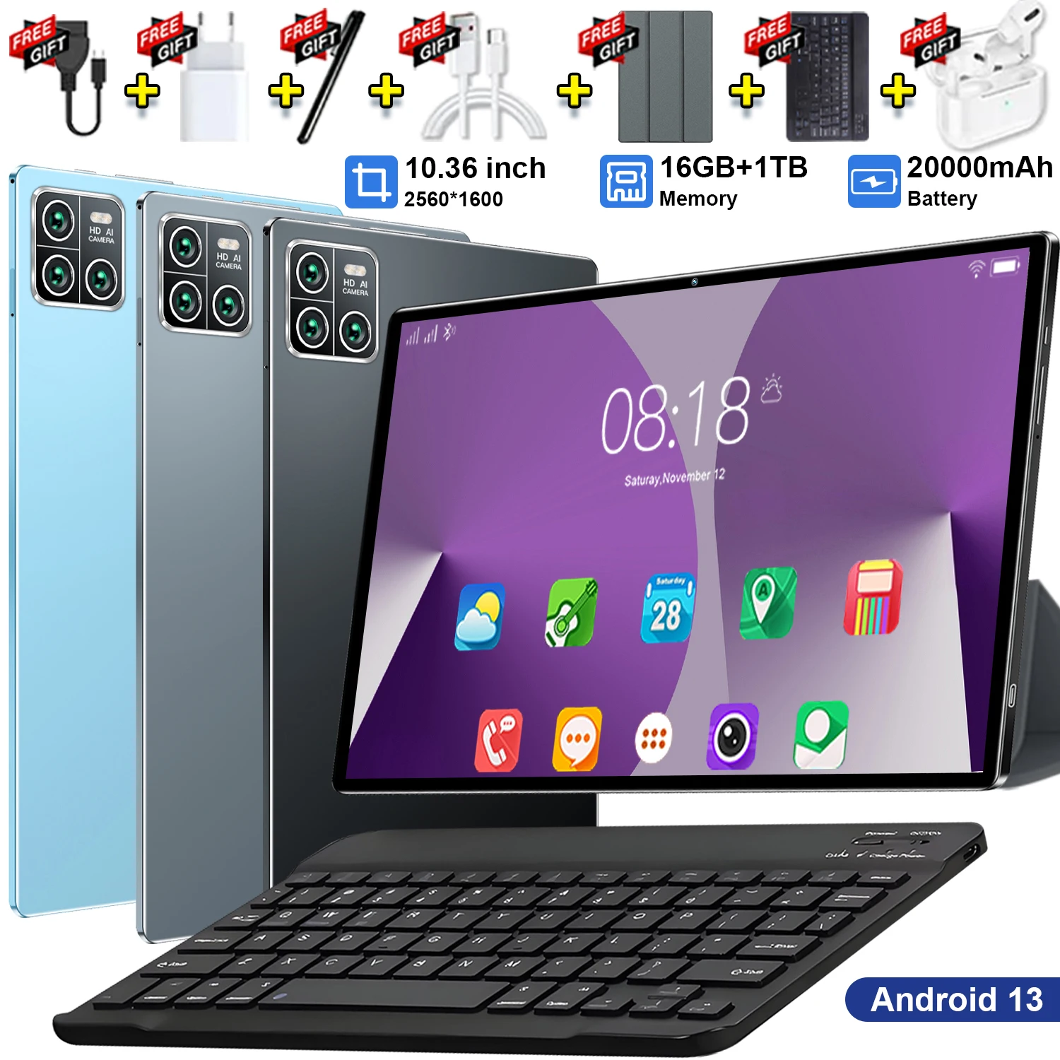 2025 dernière tablette 10.36 pouces Android 13 Pad 14 cœurs 4K HD 5G WIFI 12GB 512GB Bluetooth WPS 20000mAhtablettes double SIM