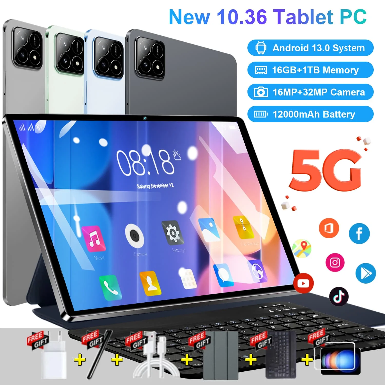 2025 5G Global nouveau Android 13 10.36 pouces 14 cœurs WIFI tablette 20000mAh 12GB 512GB Bluetooth WPS pour étudier tablette Android