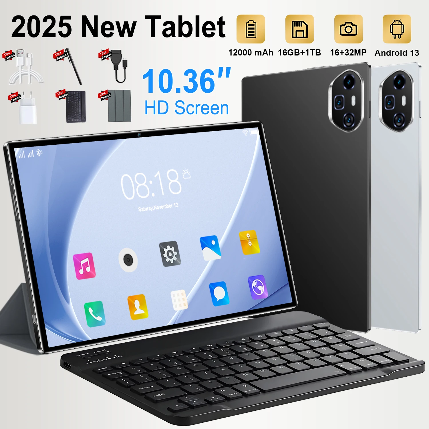 Tablette Android 2025 10.36 pouces, 12 go + 512 go, appel téléphonique double SIM 5G, batterie robuste 12000mAh, écran HD, Bluetooth, Version mondiale