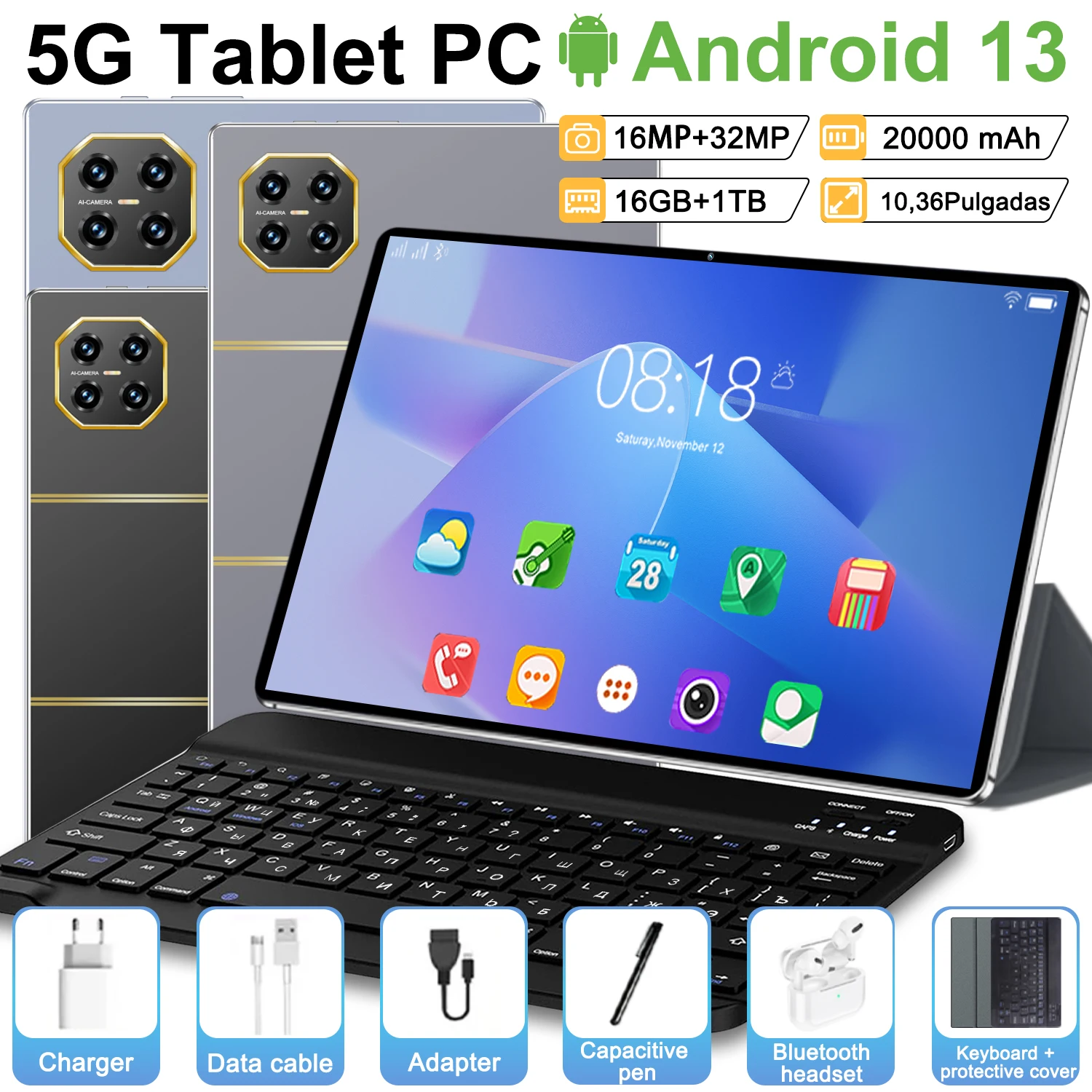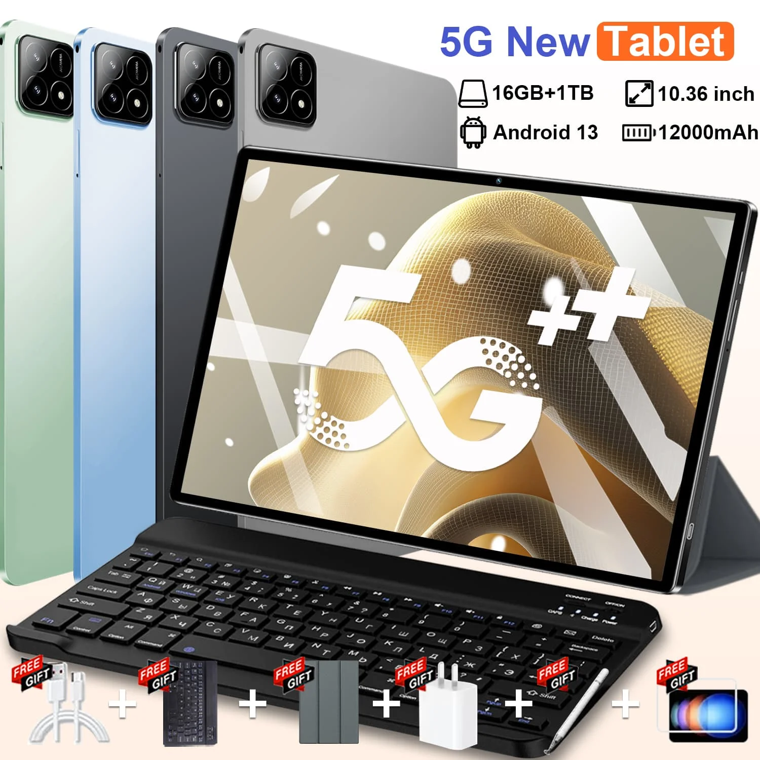 Tablette réseau WIFI 5G Android13/10.36 pouces/16MP + 32MP/10 cœurs/12000mAh/12GB + 512GB/HD, double SIM, GPS, WIFI