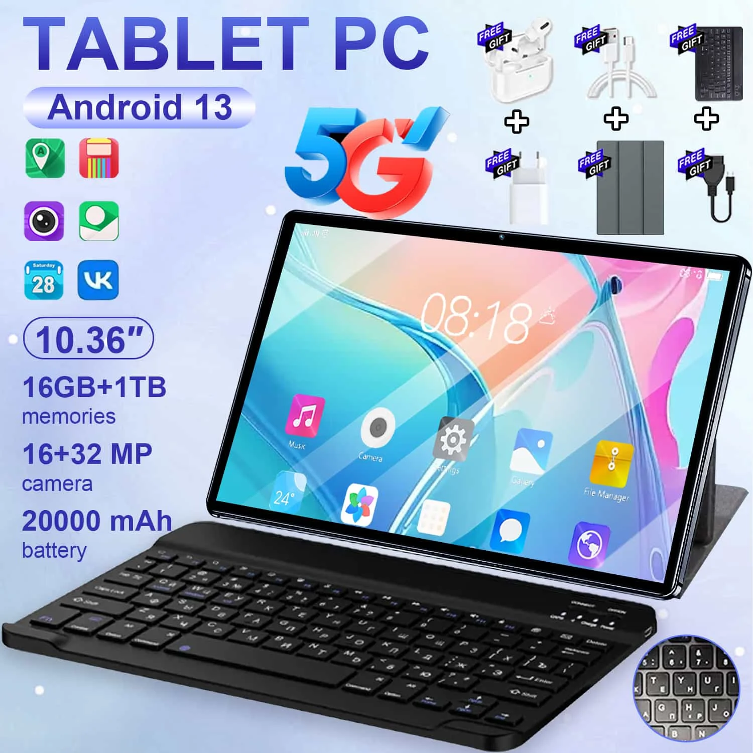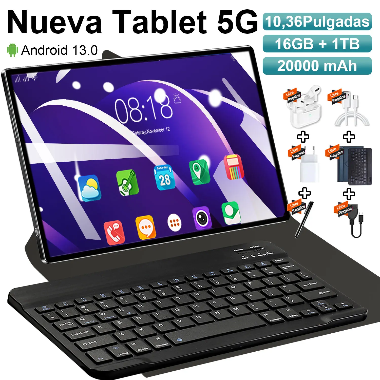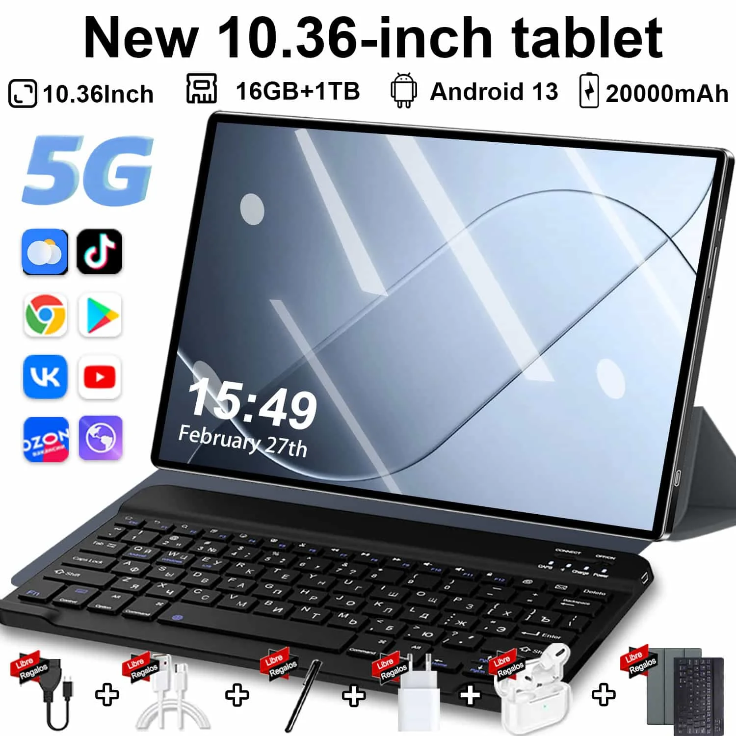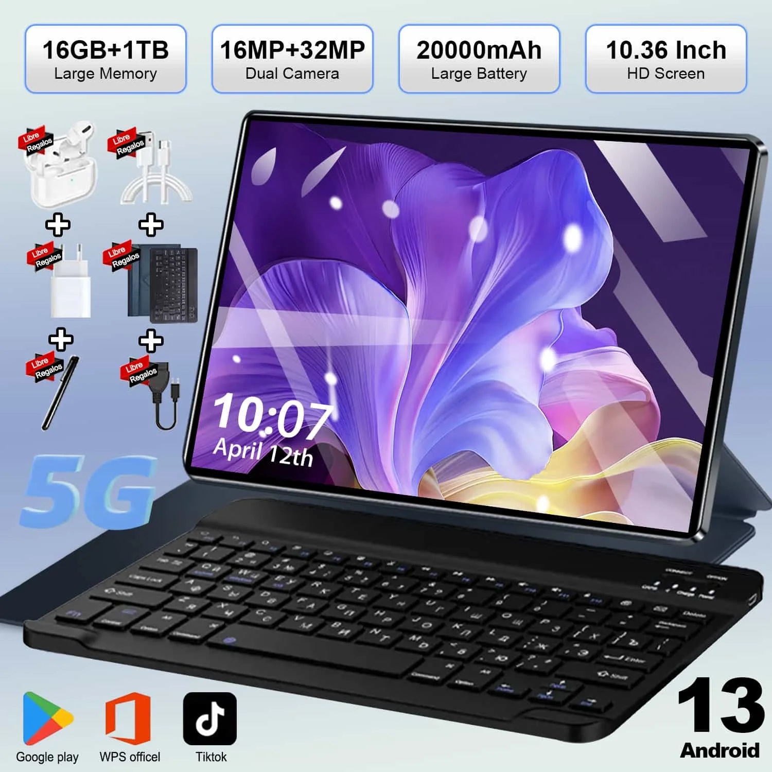 Tablette Android 13 haute Performance 5G 2026, écran IPS 4K de 10.36 pouces, stockage 12 go + 512 go, double SIM, batterie 20000mAh, WiFi BT
