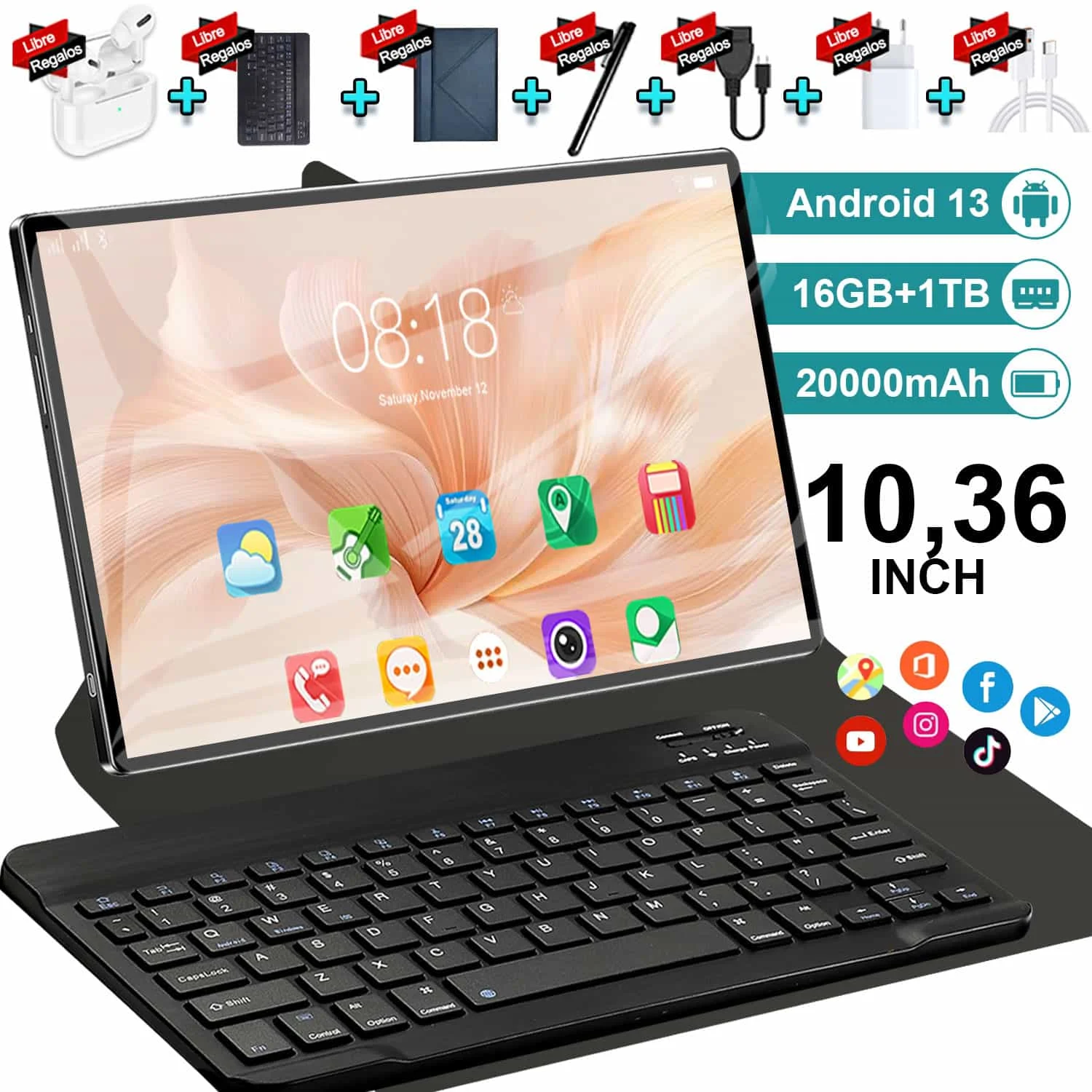Tablette Android13 10.36 pouces, 2025, originale, 12 go + 512 go, 20000mAh, 5G, 14 cœurs, double SIM, WIFI, GPS, HD, pour étudiant de bureau