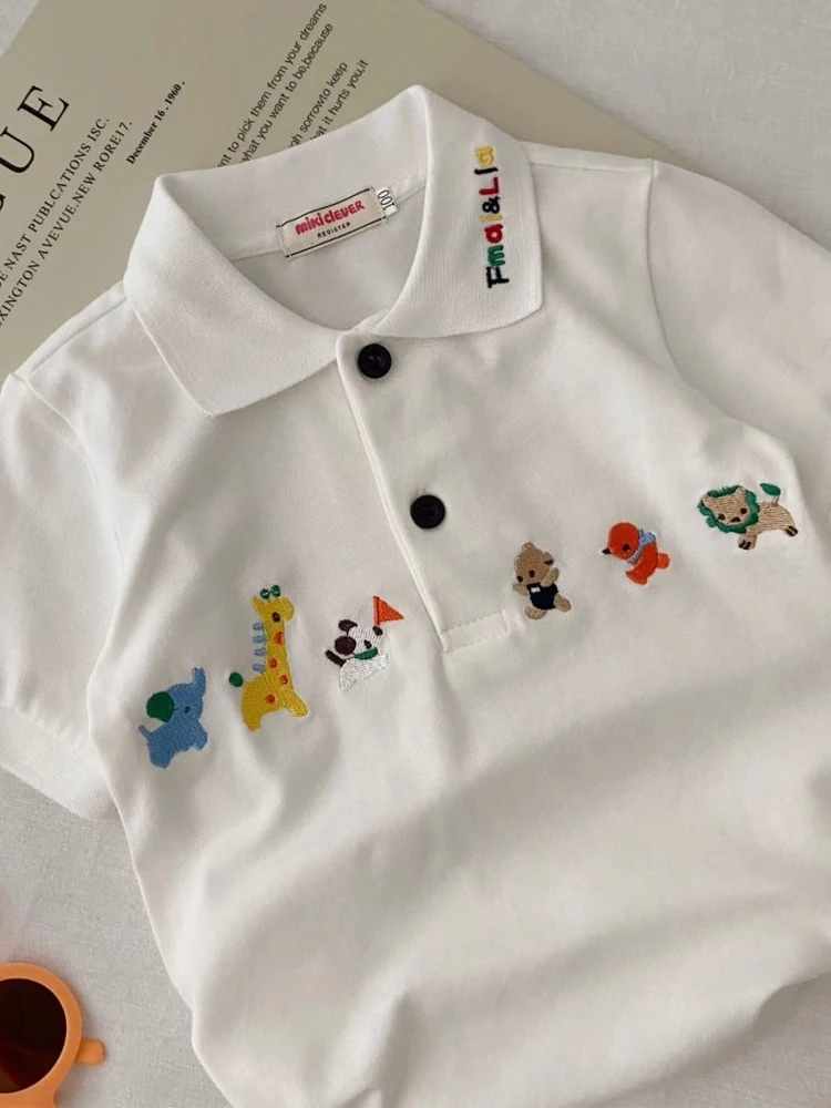 T-shirt à manches courtes en pur coton pour garçons, col brodé avec motif de dessin animé, vêtements d'été élégants pour enfants, haut polyvalent